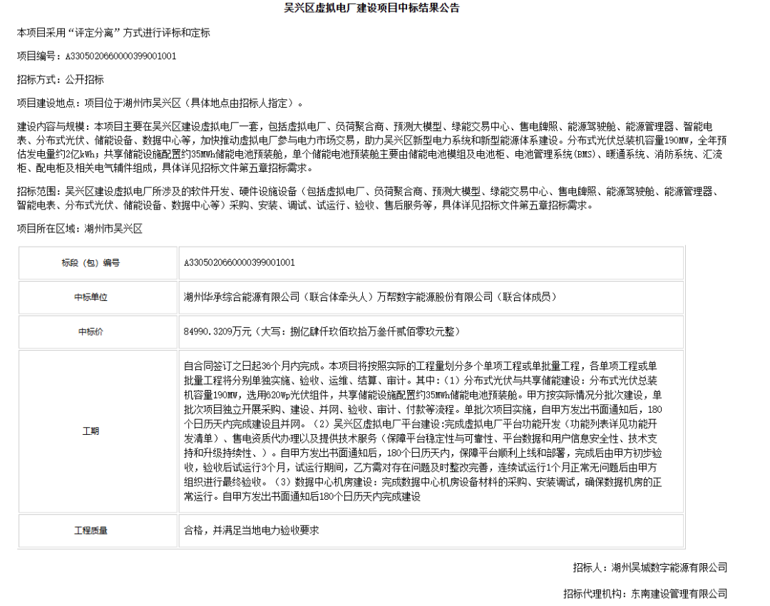 公告顯示,湖州華承綜合能源有限公司、萬幫數字能源股份有限公司聯合體以投標報價84990.3209萬元中標。