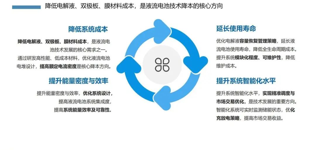 降低電解液、雙極板以及膜材料的成本,是液流電池技術(shù)發(fā)展的核心訴求之一。其關(guān)鍵降本路徑在于研發(fā)高性能且低成本的材料,優(yōu)化液流電池的電堆設(shè)計,以及提高額定電流密度。同時,提升能量密度與效率、優(yōu)化系統(tǒng)設(shè)計、提高系統(tǒng)集成度、增強系統(tǒng)能量效率及可靠性,也是技術(shù)升級的關(guān)鍵所在。