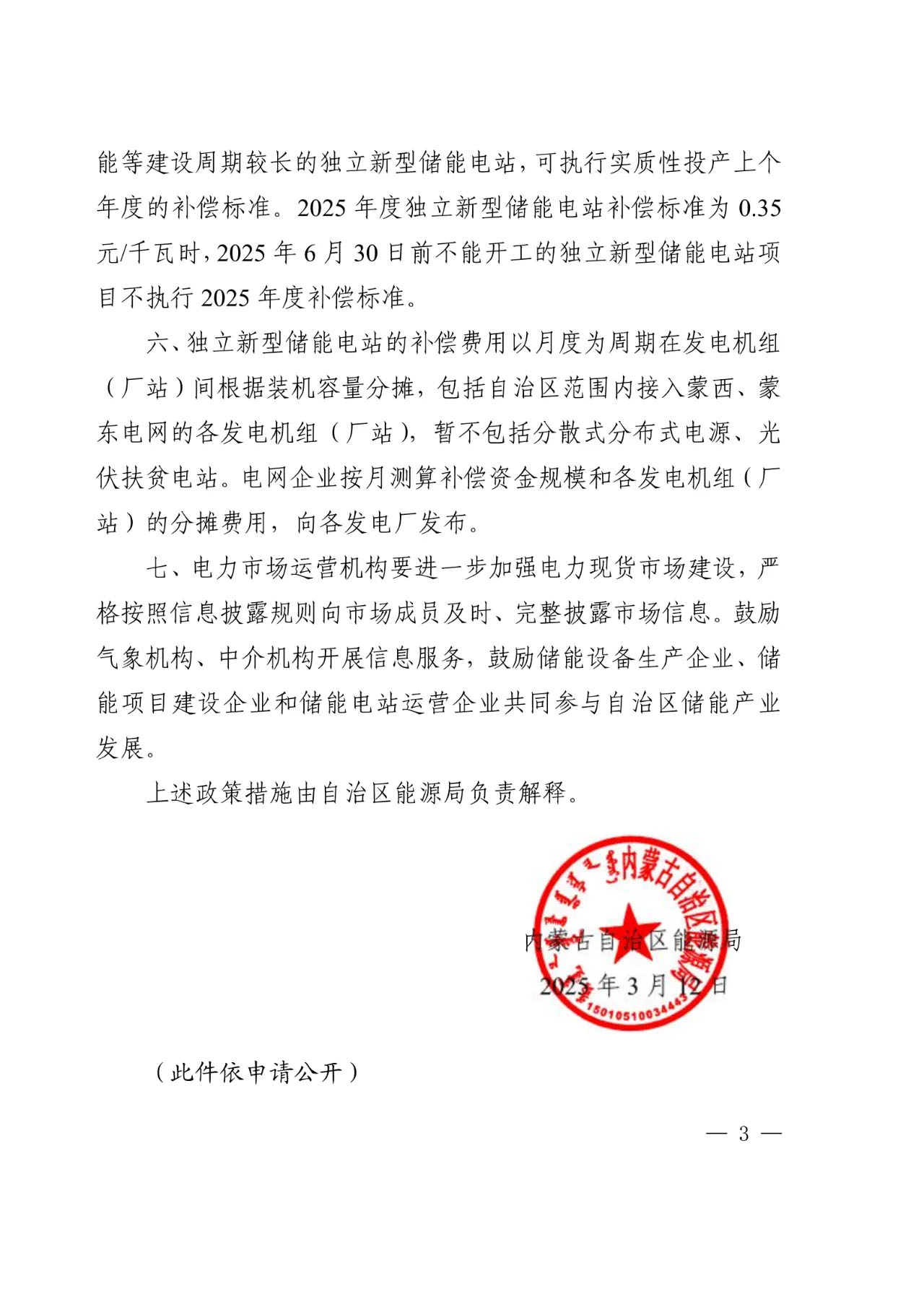 獨立新型儲能電站向公用電網(wǎng)的放電量執(zhí)行實質(zhì)性投產(chǎn)(以額定功率進(jìn)行3個充放電循環(huán)、連續(xù)并網(wǎng)試運行時間不小于72小時,下同)年度的補償標(biāo)準(zhǔn),壓縮空氣儲能、液流電池儲能等建設(shè)周期較長的獨立新型儲能電站,可執(zhí)行實質(zhì)性投產(chǎn)上個年度的補償標(biāo)準(zhǔn)。2025年度獨立新型儲能電站補償標(biāo)準(zhǔn)為0.35元/kWh,2025年6月30日前不能開工的獨立新型儲能電站項目不執(zhí)行2025年度補償標(biāo)準(zhǔn)。