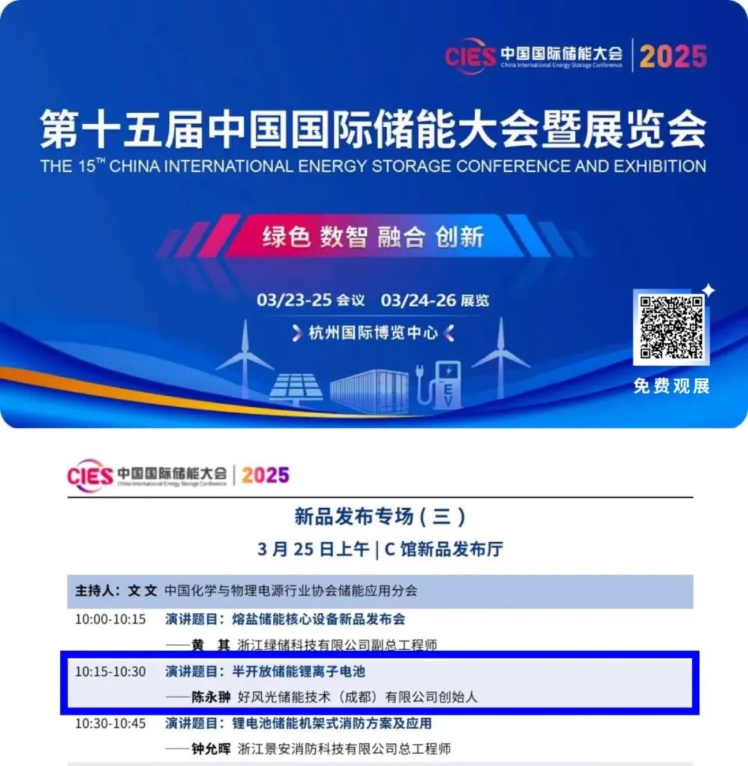 中國儲能網(wǎng)訊:第十五屆中國國際儲能大會暨展覽會于3月23日-3月26日在杭州召開,好風(fēng)光儲能將在本屆中國國際儲能大會期間進(jìn)行新品發(fā)布,正式推出目前開始進(jìn)入市場的唯一本征安全鋰離子電池-半開放儲能鋰離子電池。此次發(fā)布將重點(diǎn)展示公司在本征安全、延壽降本、綠色回收等方面的技術(shù)創(chuàng)新,并分享公司在長時儲能領(lǐng)域的最新進(jìn)展。