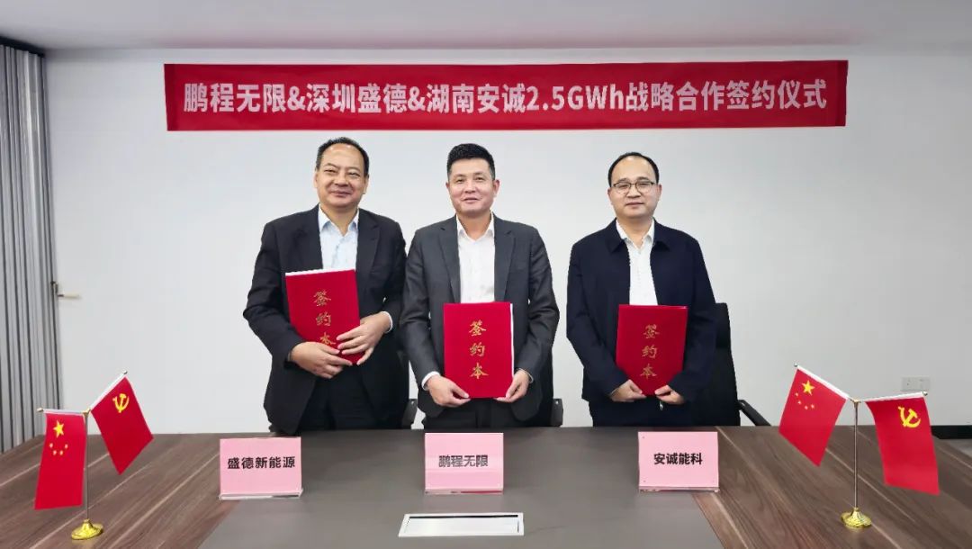 中國儲(chǔ)能網(wǎng)訊:近日,鵬程無限與深圳盛德新能源科技有限公司(以下簡(jiǎn)稱“盛德新能源”)、湖南安誠新能源有限公司(以下簡(jiǎn)稱“安誠能科”)簽署戰(zhàn)略協(xié)議,三方將圍繞2.5GWh儲(chǔ)能設(shè)備展開合作。