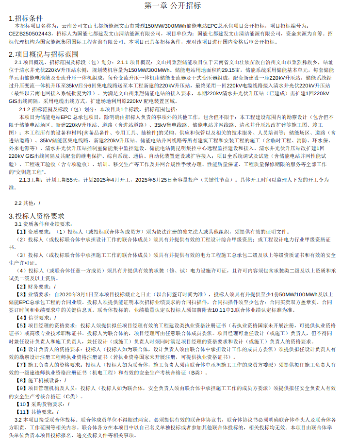 業(yè)績要求投標(biāo)人必須提供至少一份50MW/100MWh及以上的儲能EPC總承包工程的合同。