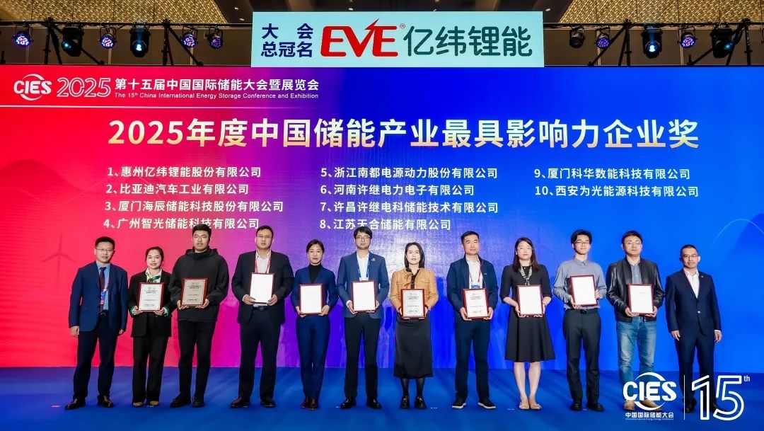 中國(guó)儲(chǔ)能網(wǎng)訊:2025年3月23-26日,CIES第十五屆中國(guó)國(guó)際儲(chǔ)能大會(huì)暨展覽會(huì)在杭州隆重召開(kāi)。億緯鋰能攜全場(chǎng)景儲(chǔ)能解決方案亮相,助力儲(chǔ)能行業(yè)高質(zhì)量發(fā)展。億緯鋰能以產(chǎn)品創(chuàng)新力、品牌影響力、市場(chǎng)競(jìng)爭(zhēng)力等方面的優(yōu)秀表現(xiàn),榮獲“2025年度中國(guó)儲(chǔ)能產(chǎn)業(yè)最具影響力企業(yè)獎(jiǎng)”,億緯鋰能高級(jí)副總裁、億緯儲(chǔ)能總裁陳翔榮獲“2025年度中國(guó)儲(chǔ)能產(chǎn)業(yè)功勛人物暨卓越貢獻(xiàn)獎(jiǎng)”。