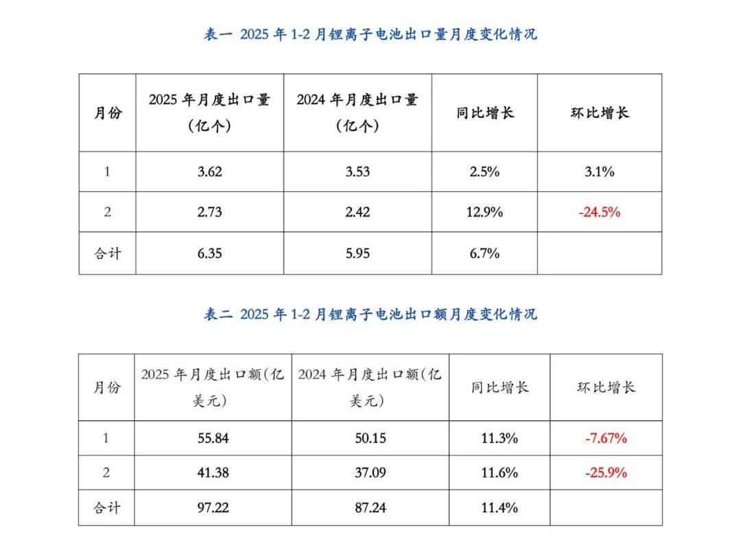 中國儲能網(wǎng)訊:2025年1-2月鋰離子電池出口數(shù)量為6.35億個,同比增長12.9%;2025年1-2月我國鋰離子電池出口額為97.22億美元,同比增加11.4%,出口總體態(tài)勢良好。其中,2025年1、2月份出口額環(huán)比分別下降7.67%和25.9%,據(jù)分析,由于企業(yè)可能在節(jié)前集中完成訂單,春節(jié)假期導(dǎo)致生產(chǎn)與出口節(jié)奏放緩,進(jìn)而影響出口環(huán)比表現(xiàn)。出口“量增價減”趨勢延續(xù),尤其是在國際市場競爭加劇的背景下,企業(yè)可能通過降價策略爭奪市場份額。2024年碳酸鋰等原材料價格下行,傳導(dǎo)至出口價格存在滯后性,企業(yè)可能通過降價清庫存或提前鎖定低價訂單,進(jìn)一步壓縮利潤空間。