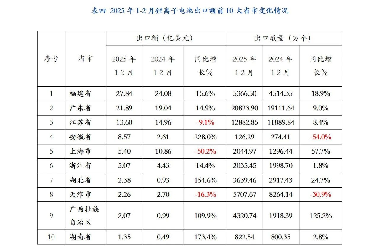 2025年1-2月福建省仍是我國鋰離子電池出口產(chǎn)品的最大來源地,出口金額為27.84億美元,同比增長15.6%,占我國鋰離子電池出口額的28.6%;出口數(shù)量為5366.5萬個,同比增長18.9%。廣東省位居第二,出口金額為21.89億美元,同比增加14.9%,占我國鋰離子電池出口額的22.5%;出口數(shù)量20823.90萬個,同比增長9%。江蘇省排名第三,出口額為13.6億美元,同比減少9.1%,占我國鋰離子電池出口額的14%;出口數(shù)量11889.84萬個,同比增長8.4%。福建、廣東和江蘇三省的鋰離子電池出口額占到全國鋰離子電池出口額的65.1%。