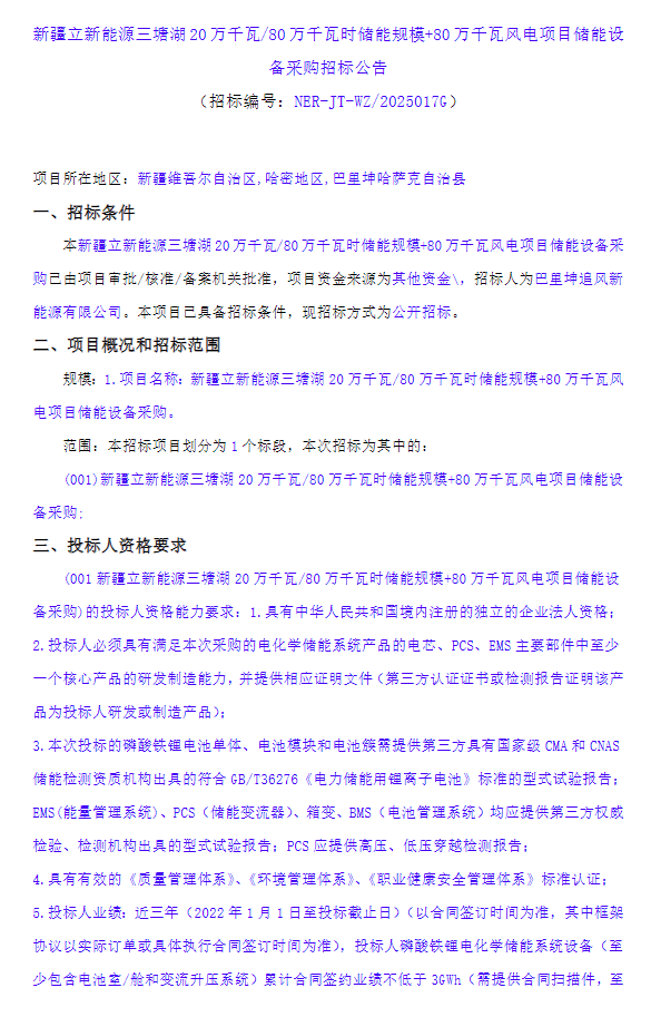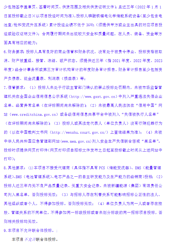 要求投標人具備電芯、PCS、EMS中至少一個核心產(chǎn)品的研發(fā)制造能力,且PCS要求具備高壓、低壓穿越檢測報告,且近三年儲能系統(tǒng)累計簽約和累計投運業(yè)績不低于3GWh。