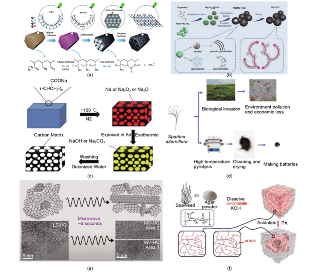 圖3 斜坡容量提升策略:(a) (b) 雜原子摻雜;(c) (d) 引入開孔;(e) (f) 低溫碳化