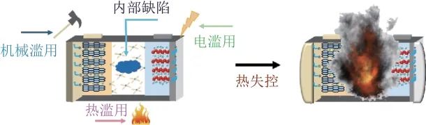 熱失控通常由各種濫用(如熱濫用、電濫用、機械濫用)觸發(fā)。同時,電池內(nèi)部潛在的電化學缺陷也可能成為潛在危害。熱失控觸發(fā)過程通常伴隨著煙霧、爆炸和火災(zāi)等能量釋放過程,圖2為鋰離子電池受到濫用或由于自身制造缺陷觸發(fā)熱失控的示意圖。