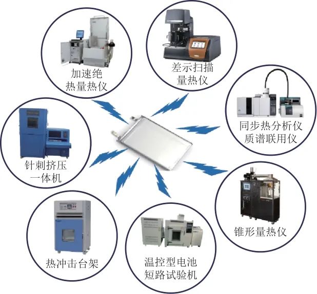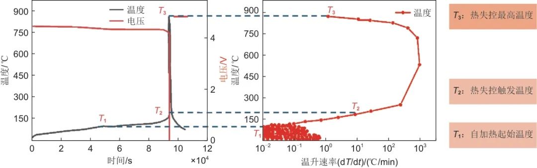 為了探究熱失控前后電池內(nèi)部的結(jié)構(gòu)變化及不同化學反應(yīng)過程,研究人員對不同體系的電池進行了不同的熱失控的觸發(fā)實驗,總結(jié)出了不同體系鋰離子電池單元在熱失控前后的共性,在單體層級為減緩熱失控過程提供理論依據(jù)。鋰離子電池熱失控測試常用儀器如圖3所示,該系列裝置能夠測試不同熱失控觸發(fā)方式下電池的熱失控特征,包括熱失控特征溫度、在熱失控各溫度階段不同材料組分之間的化學反應(yīng)以及產(chǎn)熱產(chǎn)氣特征等。加速量熱法是分析電池單元的整體熱穩(wěn)定性的一種方法,加熱過程遵循“加熱-等待-搜尋”的標準流程,并提供絕熱環(huán)境。歐陽明高團隊使用加速絕熱量熱儀對鋰離子電池不同體系進行數(shù)次熱失控測試,最終總結(jié)出鋰離子電池3個熱失控的特征溫度,分別命名為T1、T2、T3,測試結(jié)果曲線如圖4所示,分別定義為電池自產(chǎn)熱起始溫度(溫升速率達到0.02 ℃/min)、熱失控觸發(fā)溫度(溫升速率達到1 ℃/s)以及熱失控最高溫度。3個特征溫度可以作為不同體系電池熱失控的共同特征,自產(chǎn)熱的起始溫度代表著電池內(nèi)部材料結(jié)構(gòu)開始發(fā)生變化的時刻,熱失控觸發(fā)溫度代表著電池內(nèi)部快速氧化還原反應(yīng)的開始,也是電池失控的開始溫度,熱失控最高溫度代表電池能量釋放的最大點。因此,設(shè)計高安全電池的根本目標是提高自產(chǎn)熱起始溫度、熱失控觸發(fā)溫度,降低熱失控最高溫度。差示掃描量熱儀是通過測量物質(zhì)加熱過程中吸收的熱量來分析其理化特性,主要由加熱系統(tǒng)、檢測系統(tǒng)和數(shù)據(jù)處理系統(tǒng)組成。加熱系統(tǒng)采用電熱元件或激光加熱,控制環(huán)境溫度,通過檢測系統(tǒng)測量物質(zhì)吸收的熱量,一般采用熱電偶或熱輻射等測量技術(shù),最后將測量結(jié)果進行計算分析,可以用于研究化學反應(yīng)機理。同步熱分析儀質(zhì)譜聯(lián)用儀是測量物質(zhì)加熱過程中溫度—質(zhì)量變化關(guān)系以及對熱分解產(chǎn)生的氣體進行分析,從而對熱分解過程中的分解產(chǎn)物定性或定量研究。馮旭寧等使用差示掃描量熱儀和質(zhì)譜儀進行測試,將拆解后的電池的不同組分分別組合,在材料層面探究熱失控過程內(nèi)部的各種化學反應(yīng)過程。具體過程為,將單獨正極、單獨負極、正極+電解液、負極+電解液以及正極+負極+電解液的不同組合進行熱重(DSC)和熱分析-質(zhì)譜(STA-MS)測試,并結(jié)合對產(chǎn)氣元素分析得到熱失控不同階段及其對應(yīng)的化學反應(yīng)。