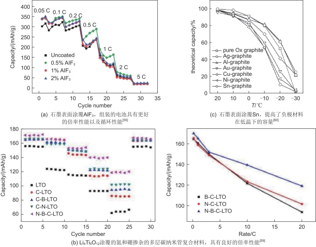 對于鋰離子電池的負極材料而言,與電解液反應(yīng)以及鋰枝晶的生長是兩個主要的安全隱患。通常副反應(yīng)以及鋰枝晶的形成發(fā)生在電極和電解液界面,因此,提高負極材料的安全性,就要保持良好的電極表面狀態(tài),可以通過表面改性來實現(xiàn)。負極表面的SEI膜對電池安全性有重要影響,近年來,研究人員研發(fā)出了人工SEI膜,以提高其熱力學性能。如,在石墨負極涂覆AlF3可以形成更穩(wěn)定、導電性更好的SEI膜,組裝的電池具有更好的倍率性能以及循環(huán)性能;Li4Ti5O12也是制造人工SEI膜常用的涂覆材料,通常與仲碳微珠、石墨、碳納米管、氮和硼摻雜的多層碳納米管復(fù)合材料等材料結(jié)合,可以使電池在快速充電時具有更好的循環(huán)性能和容量保持率,提高熱穩(wěn)定性;在石墨表面涂覆Sn可以提高負極材料在低溫下的容量和電子電導率,倍率性能也顯著提高,但需要控制涂層量,避免對電池電性能造成不利影響。無定形碳涂層的層間距較大且排列無序,能夠提高鋰離子的擴散速率,在石墨表面涂覆無定形碳可以提高石墨的可逆容量、循環(huán)穩(wěn)定性、倍率性能以及低溫性能。提高鋰離子的固相擴散速率有利于抑制鋰枝晶的形成和生長,主要包括增大石墨層間距和縮短鋰固相擴散距離。微膨脹處理及石墨擴邊處理可以增大石墨層間距,但微膨脹處理的石墨表面具有微缺陷降低了其可逆容量;使用納米碳材料可以縮短鋰固相擴散距離,然而,納米材料的高比表面積導致電極表面的副反應(yīng)增加,電池的庫侖效率下降。除此之外,SEI膜的形成還與電解液的成分有關(guān),在電解液中加入添加劑,有助于形成更均勻的SEI膜,減緩鋰枝晶的形成。具體方法在2.3節(jié)中概述。負極材料改善策略如圖7所示。