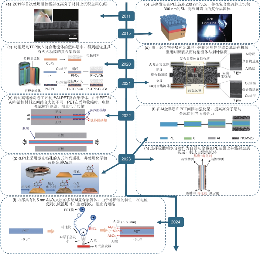 2011年,Yun等首次采用磁控濺射技術(shù)在塑料層上沉積了Cu金屬層,塑料層材料包括聚萘二甲酸乙二醇酯(PEN)、聚對苯二甲酸乙二醇酯(PET)、聚酰亞胺(PI)和聚醚砜(PES),并且測試了不同厚度金屬Cu層的復(fù)合集流體電阻。2015年,Jung等通過熱蒸發(fā),在PI基底上沉積了200 nm的Cu,又在PI-Cu集流體上沉積300 nm的納米Si,獲得可彎曲的復(fù)合集流體。2020年,Cui等通過將嵌入有磷酸三苯酯(TPP)阻燃劑的聚酰亞胺上沉積了500 nm的超薄Cu金屬層制成了超輕聚酰亞胺基集流體,這種設(shè)計將阻燃劑與電子或者離子通路隔斷,在電池正常工作時不影響性能,但當電池內(nèi)部溫度升高到TPP熔點250 ℃,TPP融化釋放到電池內(nèi)部,阻斷內(nèi)部組件的燃燒。并通過實驗驗證了在復(fù)合集流體中加入阻燃劑不影響電池正常工作。同時,將傳統(tǒng)電芯與加入阻燃劑的復(fù)合集流體電芯點燃,復(fù)合集流體火焰微弱,自熄滅時間為6 s小于傳統(tǒng)電芯的20 s。2021年,Pham等在聚合物基底涂覆Al金屬和Cu金屬層,并使用18650電池進行安全性能測試,在針刺測試過程中溫度升高引起聚合物基底收縮,使得正負極活性材料由于缺乏與集流體的結(jié)合而開裂,并且由于聚合物的收縮也使得復(fù)合集流體迅速撤離靠近針的部分,斷開電子的傳輸路徑,阻止內(nèi)短路的發(fā)生。2022年,黃云輝等采用高速卷對卷工藝制備了以PET為基底的Al-PET復(fù)合集流體。所得的復(fù)合集流體厚度為7.5 μm,面密度為1.15 mg/cm2。對復(fù)合集流體的力學性能以及電性能進行測試,并與厚度為14 μm(面密度3.89 mg/cm2)的傳統(tǒng)集流體比較,重量減小70.4%,厚度減小46.4%,金屬用量減少89.3%。不僅提高了比能量密度,也降低了成本,并且在單軸拉伸測試下,Al-PET集流體的彈性模量為5.1 GPa ± 0.1 GPa,斷裂應(yīng)變?yōu)?2% ± 4%,斷裂強度為196 MPa ± 21 MPa;而傳統(tǒng)集流體彈性模量為14.4 GPa ± 0.4 GPa,斷裂應(yīng)變3% ± 1%,斷裂強度為194 MPa ± 3M Pa。說明Al-PET復(fù)合集流體雖然減小了模量,但機械強度仍然足夠,滿足加工性能。并且,傳統(tǒng)集流體的斷裂應(yīng)變(大約為3%)和Al-PET復(fù)合集流體斷裂應(yīng)變(大約為92%)間具有較大差異,也解釋了Al復(fù)合集流體提高安全性的本質(zhì)原因。在不同拉伸程度時測試復(fù)合集流體電阻,發(fā)現(xiàn)電阻隨著拉伸應(yīng)變增加而增加,這使得電池在針刺測試時,電阻增加,防止了局部電導的突增,提高安全性。同時,觀察到在拉伸過程中,涂覆有活性材料的復(fù)合集流體的Al-PET隨著拉伸寬度變窄,而活性材料層并沒有顯著變形,并且活性材料從集流體上脫落,說明Al與PET之間具有強的界面結(jié)合力,與活性材料間結(jié)合力較弱。因此,在電池受到熱濫用之前,變成橫向絕緣,阻止后續(xù)反應(yīng)的發(fā)生。但復(fù)合集流體中間添加了高分子層,由于其對電解質(zhì)的耐受性較差,浸泡在電解質(zhì)中會產(chǎn)生高分子層與金屬層脫層的現(xiàn)象。2023年,汪茹等采用PET作為支撐基材,通過在鋁金屬鍍層與高分子基材之間引入氧化物(AlOx或SiOx)中間層,有效增強了金屬與高分子基材之間的界面結(jié)合力,提升復(fù)合集流體的電解液兼容性。2023年,Wu等為了增強金屬層與高分子層之間界面結(jié)合力,通過在高分子層聚酰亞胺(PI)上采用激光鉆孔的方式陣列通孔,并采用化學鍍的方法在聚酰亞胺薄膜上沉積金屬Cu層。這種工藝方法不僅降低重量,提高力學性能,還提高接觸面積,增大導電面積,減小電池電阻。并且,打孔陣列和鍍層的粗糙表面為活性材料提供了更高的鍵合,相較于光滑的銅箔不易分離,提高了電池的循環(huán)性能。為了打斷電池在熱失控早期的一些副反應(yīng),2023年,彭勇等首次提出自毀電池的概念,并對自毀電池的研究進展進行了總結(jié)。在探究清楚電池熱失控機理的基礎(chǔ)上,通過在特定條件下釋放化學試劑,對電池內(nèi)部熱失控前期特定化學反應(yīng)進行阻斷,實現(xiàn)材料層面的自毀。選擇自毀劑為硫酸鋁水合物,和其他漿料一起攪拌均勻后涂覆在PE基膜上,并采用磁控濺射Cu金屬層,制備成了含有自毀劑的復(fù)合集流體,并組裝成電芯。根據(jù)徐鵬等對硫酸鋁水合物進行的熱重分析,樣品的首次失重在90 ℃左右開始直到300 ℃附近,失重率為38.22%。因此,選擇硫酸鋁水合物作為自毀劑可以在特定的溫度下釋放出水,提前于電解質(zhì)與負極活性Li反應(yīng),消耗副反應(yīng)的反應(yīng)物,降低熱失控程度。2024年,彭勇等在聚對苯二甲酸乙二醇酯的塑料基底上通過真空蒸發(fā)法涂覆內(nèi)部具有約5 nm Al2O3夾層的多層Al,Al-Al2O3多層金屬層固有的易斷裂特性使其在受到機械變形時產(chǎn)生微裂紋,有利于切斷短路,抑制進一步的熱失控發(fā)生。集流體的發(fā)展現(xiàn)狀如圖8所示。