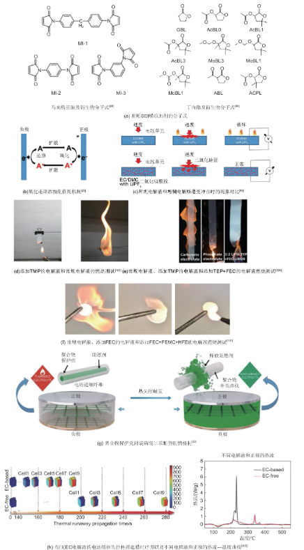 當熱失控早期反應(yīng)無法有效阻斷時,為避免后續(xù)更嚴重的火災(zāi)和爆炸,研究人員向傳統(tǒng)的有機電解質(zhì)中添加阻燃劑或者使用不可燃的電解質(zhì)。當可燃物在氧化劑的作用下受熱會產(chǎn)生化學反應(yīng)并燃燒,產(chǎn)生可燃烴和氧等自由基。最常用的阻燃劑是含磷或者含鹵素的材料,可以通過捕獲自由基來阻止后續(xù)燃燒。阻燃劑要滿足:①少量時仍具有高的阻燃效率;②常規(guī)電解質(zhì)中良好的溶解性;③低揮發(fā)性;④在電解質(zhì)中具有低黏度;⑤良好的電化學穩(wěn)定性;⑥與電極和隔膜良好的浸潤性。常用的阻燃添加劑包括磷酸鹽(如磷酸三甲酯TMP、磷酸三乙酯TEP、甲基膦酸二甲酯DMMP;優(yōu)點:阻燃效果好、成本低;缺點:黏度高、會在負極分解)、氟化物和氟化磷酸鹽(如氟代碳酸亞乙酯FEC、甲基九氟丁基醚MFE;優(yōu)點:黏度低、電化學穩(wěn)定性好、有助于SEI膜形成;缺點:成本高)和氟化磷腈(優(yōu)點:阻燃效率高、電化學穩(wěn)定性好、有助于SEI膜形成;缺點:黏度高、成本高)。在濫用條件下,根據(jù)研究人員的測試,添加了阻燃劑的電解質(zhì)不會被點燃。只添加一種阻燃劑產(chǎn)生的阻燃效果不明顯,通常多種阻燃元素的協(xié)同作用產(chǎn)生的阻燃效率高,并且具有穩(wěn)定的電化學性能和良好的熱穩(wěn)性,如氟化磷酸酯、氟化磷腈的協(xié)同阻燃添加劑。然而,直接將阻燃劑添加到電解質(zhì)中可能會影響電解質(zhì)的電導率,從而影響電池電性能。研究人員為解決此問題,設(shè)計了一種將磷酸三苯酯封裝在保護性聚合物殼內(nèi),防止阻燃劑直接暴露于電解質(zhì),如果電池發(fā)生熱失控,則聚合物殼將隨著溫度升高而熔化,釋放磷酸三苯酯,有效抑制高度易燃電解液的燃燒。提高電解質(zhì)安全性的根本是開發(fā)出不可燃的電解質(zhì),包括已經(jīng)使用的離子液體電解質(zhì),具有非揮發(fā)性,但黏度高、成本高以及倍率性能低等;低分子量氫氟醚是另一類不可燃液體電解質(zhì),因為它們具有高閃點或無閃點、不可燃性、低表面張力、低黏度、低凝固溫度等特性。全氟聚醚(PFPE)是已經(jīng)研發(fā)出來的氫氟醚電解質(zhì),它可以確保它的分子與電池內(nèi)部的相容性,同時具有不燃性和好的熱穩(wěn)性。在傳統(tǒng)鋰離子電池研究中,鋰離子的可逆脫嵌是通過電解質(zhì)中EC對石墨負極的良好鈍化來保證的,并且EC較寬的電化學窗口使得電池在各種工況下工作,所以,具有EC的電解質(zhì)運用廣泛。但由于EC高溫下容易分解降低了電池的熱安全性也限制了具有EC電解質(zhì)的發(fā)展。2014年,Yamada等首次提出,在使用超高鹽濃度的電解液而不使用EC時,也可以使電解液和石墨負極之間實現(xiàn)良好的匹配。無EC電解液是一種新型的電解液,它通過將當前電解液體系中的EC成分換成醚類、砜類、氟化碳酸鹽等來提高電池性能。為了提高電池的熱安全性,Wu等使用無EC電解液構(gòu)建了富含無機物的界面膜,使得電池的耐高低溫性能得到提升。電解質(zhì)的改善策略示意圖如圖9所示。