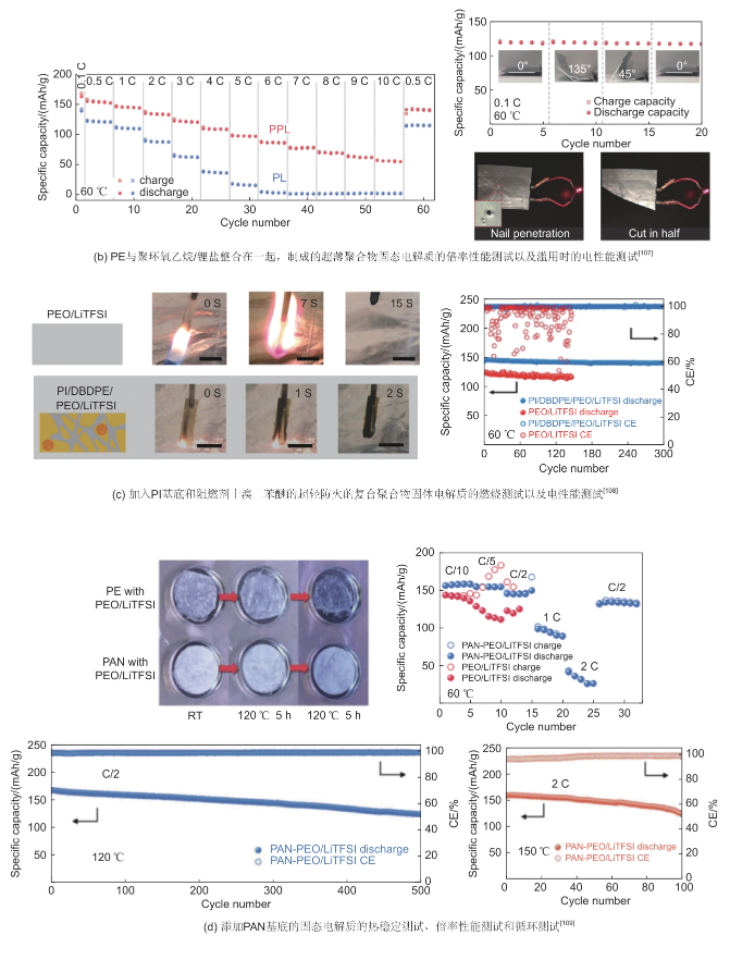 研究人員已經(jīng)采用各種優(yōu)化設(shè)計來提高液體電解質(zhì)的安全性,但非揮發(fā)性的固態(tài)電解質(zhì)具有更高的安全性,固態(tài)電解質(zhì)可以為電池提供機械支撐,在機械濫用下也能防止短路,并且近年來已經(jīng)開始研究并對其性能進行優(yōu)化。Wang等為了改善固態(tài)電解質(zhì)厚度較大以及機械強度較差等問題,在聚合物固態(tài)電解質(zhì)中又添加了聚合物基底PI膜,納米纖維PI膜孔隙率為82%,是均勻和獨立的網(wǎng)絡(luò)結(jié)構(gòu),促進了聚合物電解質(zhì)的滲透,保證在復(fù)合電解質(zhì)中進行有效的離子移動。同時,更薄且具有更高強度的PI層可以阻擋鋰枝晶的生長,提高電池安全性的同時保持了良好的倍率性能和循環(huán)穩(wěn)定性。雖然固態(tài)電池具有更高安全性,但室溫下離子電導率較差,限制其發(fā)展。為了解決此問題,Wu等將PE與聚環(huán)氧乙烷(PEO)/鋰鹽整合在一起,制成超薄聚合物固態(tài)電解質(zhì)(約7.5 μm),縮短了鋰離子在電解質(zhì)中的擴散距離和時間,并在室溫下有足夠的離子電導。對改進的固態(tài)電池進行電性能和機械柔性進行測試,結(jié)果表明,在30 ℃、0.1 C倍率下能夠保持穩(wěn)定的循環(huán),在60 ℃、1 C倍率下也能夠?qū)崿F(xiàn)500次循環(huán)。此外,在不同彎曲程度下連續(xù)充放電,容量不受彎曲程度影響,說明改進的固態(tài)電解質(zhì)具有良好的機械柔性;并且同其他現(xiàn)有技術(shù)相比,此優(yōu)化策略具有最好的倍率性能。Cui等設(shè)計了一種超輕防火的復(fù)合聚合物固體電解質(zhì),固態(tài)電解質(zhì)組成:多孔機械增強劑(PI)、阻燃劑(十溴二苯醚)和聚合物電解質(zhì)。并通過測量超輕防火電解質(zhì)的自熄滅時間以對阻燃性進行評估,同時,和不含有PI以及阻燃劑的原始固態(tài)電解質(zhì)(自熄滅時間為15 s)相比,超輕防火電解質(zhì)的自熄滅時間顯著減小(2 s),證明了其優(yōu)異的阻燃性。Ma等使用靜電紡絲設(shè)備將聚丙烯腈(PAN)基質(zhì)在靜電力作用下紡織成膜,通過靜電紡絲得到的膜均勻獨立且具有柔性。為了使膜薄且致密,有利于更好的抑制鋰枝晶的形成,將得到的薄膜輥壓,最后浸漬聚環(huán)氧乙烷/Li鹽電解質(zhì)得到改進的固態(tài)電解質(zhì)。并證明了在大電流下可以有效抑制鋰枝晶生長,并且具有良好的倍率性能、循環(huán)穩(wěn)定性和熱穩(wěn)定性。固態(tài)電解質(zhì)的改善策略如圖10所示。