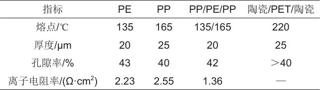 隔膜作為電池內(nèi)部另一種非功能性結(jié)構(gòu),也是影響鋰離子電池性能和安全性的重要部分。通常,增加隔膜開始熔化閉孔與開始收縮并發(fā)生局部內(nèi)短路的時間間隔有利于提高電池安全性。Celgard公司開發(fā)的PP/PE/PP的三層結(jié)構(gòu)的隔膜已經(jīng)商業(yè)化使用,根據(jù)PE隔膜的熔點為135 ℃,PP隔膜熔點為165 ℃,由于使用不同熔點的隔膜,延長了隔膜閉孔和收縮之間的時間。表1為常用商用隔膜的典型特征。在溫度高于135 ℃時,PE熔化,而PP保持完好,并且開始閉孔,阻止電荷傳輸,并防止內(nèi)短路。對隔膜結(jié)構(gòu)進行改善也可以阻止鋰枝晶的形成,Cui等將二氧化硅顆粒夾在PE隔膜之間,制成了三明治結(jié)構(gòu)。并證明了鋰枝晶與二氧化硅顆粒反應(yīng)可以阻止鋰枝晶的進一步生長,從而提高電池壽命。由于在電解質(zhì)中直接添加阻燃劑可能會降低電池性能,Chou等將三氧化二銻與阻燃劑十溴二苯醚(DBDPE)涂敷在PE隔膜上,結(jié)果比常規(guī)的PE隔膜阻燃性提高了4倍且對電化學性能的影響也減小。Liu等為了改善阻燃劑對電化學性能的影響,通過用陶瓷二氧化硅微膠囊涂覆的PE隔膜來制造熱響應(yīng)復(fù)合隔膜,陶瓷二氧化硅微膠囊內(nèi)部封裝有相變材料(硬脂酸)和阻燃劑(TEP),在提高安全性的同時可以避免直接與電解質(zhì)接觸,降低電池電化學性能,跟傳統(tǒng)隔膜相比,倍率性能也有提高。為了防止過充電對安全性的影響,Li等將一種親電活性聚合物(3-癸基噻吩)浸泡進商用隔膜中,并將其用作電位開關(guān),以可逆地保護鋰離子電池的過充電。Wu等設(shè)計了一種“聚合物-金屬-聚合物”三層隔膜,可以提供電壓感測功能,當枝晶生長出來并到達中間層時,它將連接金屬層和負極,使它們之間電壓突降,并被檢測出來,從而及時切斷電池工作。隔膜的改善策略如圖11所示。