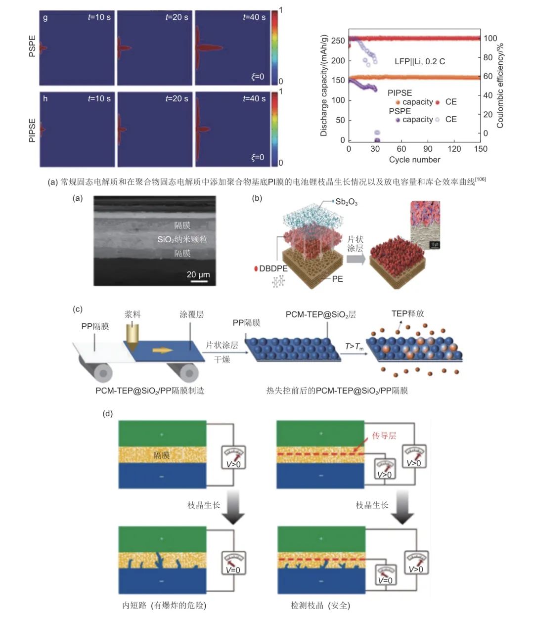 圖11 隔膜的改善策略 (a) 具有SiO2納米顆粒夾層的隔膜,能夠阻止鋰枝晶的生長,延長電池壽命;(b) 涂有三氧化二銻與阻燃劑十溴二苯醚的隔膜,大大提高阻燃性;(c) 涂覆內(nèi)部封裝有相變材料和阻燃劑的二氧化硅微膠囊的隔膜,具有阻燃性且不影響倍率性能;(d) 用于鋰枝晶早期檢測的雙功能隔膜,由兩個隔膜和中間的導電Cu層組成