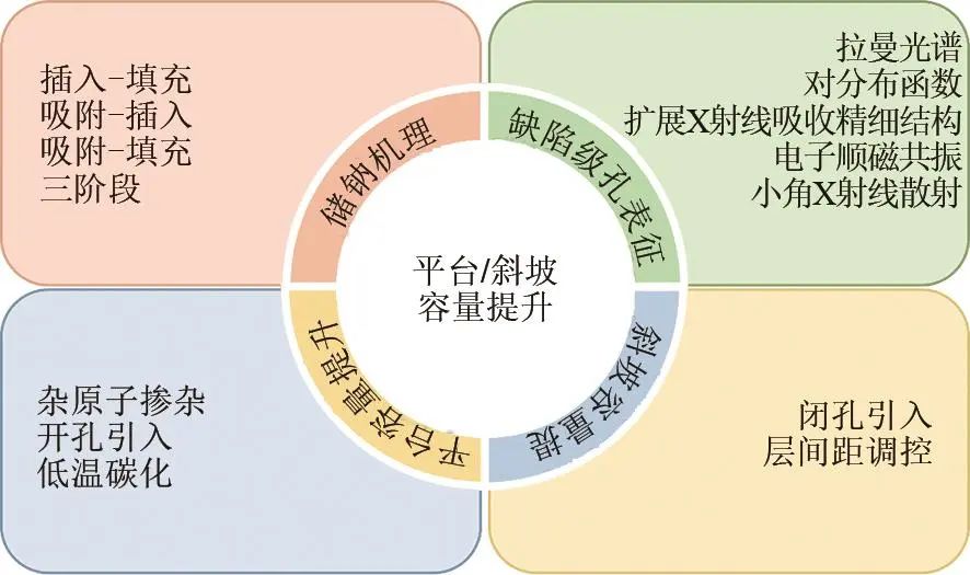 硬碳容量可以分為0.1 V以上的斜坡容量和0.1 V以下的平臺容量(圖1)。斜坡容量具有高的動力學(xué)響應(yīng)速度,提升斜坡區(qū)容量可以改善倍率性能及循環(huán)性能。斜坡容量提升策略主要通過調(diào)控硬碳的缺陷或結(jié)構(gòu)特征,來增加鈉離子的吸附和擴大鈉離子的擴散路徑。平臺區(qū)具有較低的放電電壓,這直接影響鈉離子電池的能量密度和功率密度。平臺容量提升策略則側(cè)重于對孔的改性,以增強硬碳的儲鈉位點。對于不同的硬碳材料,其斜坡/平臺容量提升策略不盡相同且目前尚無綜述對斜坡/平臺區(qū)提升策略進(jìn)行系統(tǒng)綜述,因此有必要進(jìn)行深入探討與討論。本文首先綜述了硬碳在鈉離子電池中的儲鈉機理,其次綜述了缺陷以及孔結(jié)構(gòu)的表征方法,并詳細(xì)探討不同策略在提升硬碳容量方面的最新進(jìn)展和應(yīng)用前景。希望通過這些討論,為未來的研究提供有價值的參考。
