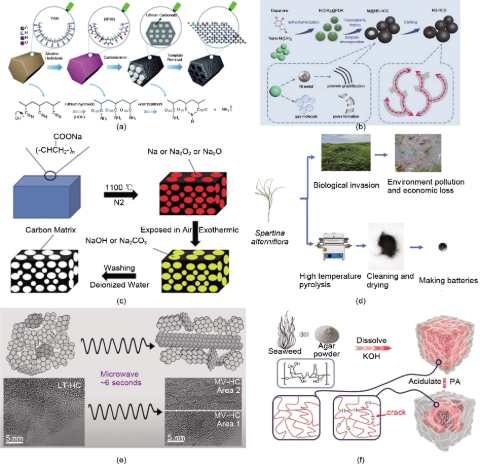 圖3 斜坡容量提升策略:(a) (b) 雜原子摻雜;(c) (d) 引入開孔;(e) (f) 低溫碳化