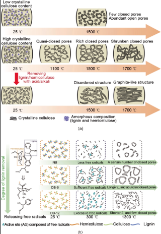 深入了解閉孔的形成機理有利于構(gòu)建高容量硬碳負(fù)極的合理設(shè)計。Tang等通過碳化三種不同結(jié)晶度的生物質(zhì)前驅(qū)體發(fā)現(xiàn),復(fù)合生物質(zhì)中高結(jié)晶度的纖維素可以轉(zhuǎn)化為長的類石墨層,這種類石墨層傾向于形成封閉孔結(jié)構(gòu)。復(fù)合生物質(zhì)中的無定形組分(例如木質(zhì)素、半纖維素)有助于防止高溫碳化過程的過度石墨化。但其在研究過程中并未關(guān)注低溫碳化時碳結(jié)構(gòu)的演變。因此,Wang等通過釋放前驅(qū)體中的自由基的手段補充了低溫?zé)峤舛伍]孔的形成機理。天然竹材經(jīng)過適當(dāng)?shù)拿撃舅靥幚砗?,其自由基暴露出來,增強了碳化反?yīng)活性。充足的自由基促進(jìn)了前驅(qū)體碎片在碳化反應(yīng)中的利用,從而得到了發(fā)達(dá)的碳層,形成了豐富的閉孔。但是,當(dāng)木質(zhì)素幾乎完全被去除時,大量自由基形成的活性位點競爭利用體相中有限的前體碎片形成短的碳層。小的微晶尺寸使硬碳更容易堆積和致密化,導(dǎo)致開孔以及閉孔的減少以及真密度的增加,如圖4所示。