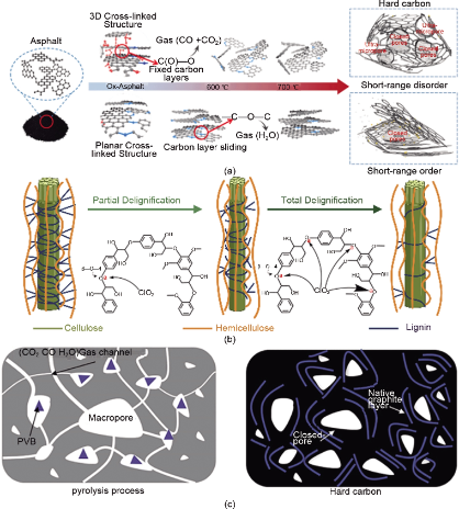 對于復(fù)合類生物質(zhì)如木材、竹子,一方面可以從前驅(qū)體進(jìn)行優(yōu)化。Deng等通過硫酸將羧基引入松木中的木質(zhì)素從而在硬碳中引入大量閉孔結(jié)構(gòu)。除了對官能團進(jìn)行改性,也可以優(yōu)化前驅(qū)體成分來引入閉孔結(jié)構(gòu)。Wang等通過脫除竹子中的木質(zhì)素來引入閉孔結(jié)構(gòu)。一方面木質(zhì)素的脫除可以在前驅(qū)體中木質(zhì)素被脫除的位置形成孔結(jié)構(gòu),從而在碳化后這些孔可以遺傳到硬碳中。另一方面木質(zhì)素的脫除會導(dǎo)致β—O—4鍵的斷裂從而形成氧中心自由基,這些自由基會導(dǎo)致閉孔的生成,優(yōu)化后的硬碳在20 mA/g的電流下具有355 mAh/g的比容量。另一方面可以從碳化過程對碳層長短進(jìn)行優(yōu)化。Zhao等通過利用Mn2+的催化效果將短碳層在碳化過程中連接起來,長碳層結(jié)構(gòu)傾向于圍成閉孔結(jié)構(gòu)。