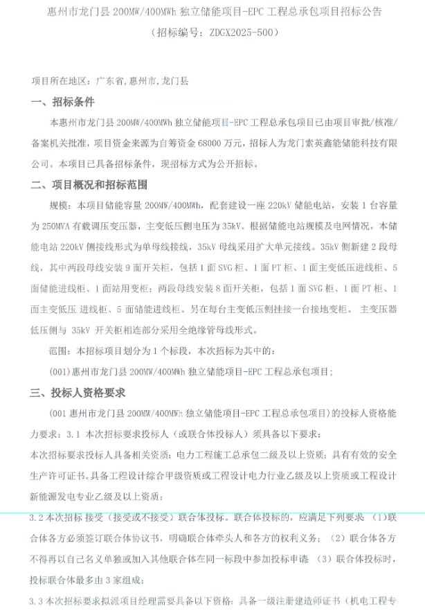 中國(guó)儲(chǔ)能網(wǎng)訊:4月1日,龍門索英鑫能儲(chǔ)能科技有限公司發(fā)布廣東惠州200MW/400MWh獨(dú)立儲(chǔ)能EPC招標(biāo)公告,項(xiàng)目資金為自籌資金68000萬元,約合1.7元/Wh。