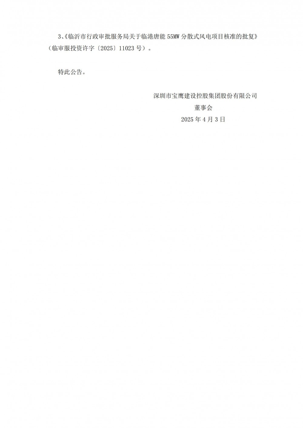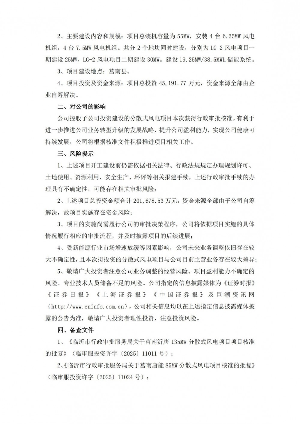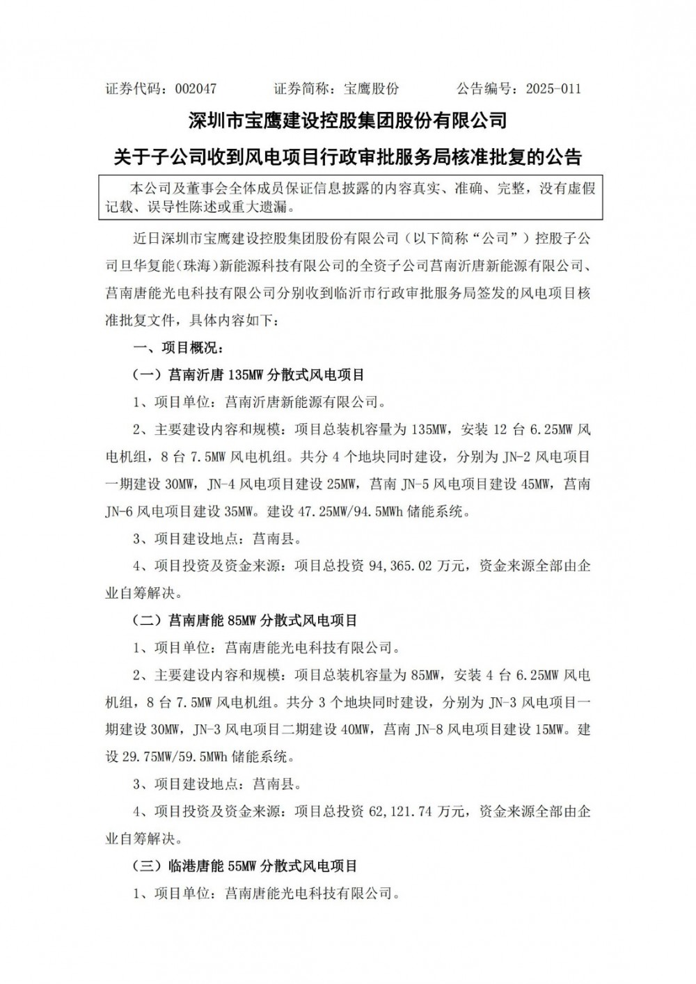 公告顯示,近日深圳市寶鷹建設(shè)控股集團(tuán)股份有限公司控股子公司旦華復(fù)能(珠海)新能源科技有限公司的全資子公司莒南沂唐新能源有限公司、莒南唐能光電科技有限公司分別收到臨沂市行政審批服務(wù)局簽發(fā)的風(fēng)電項(xiàng)目核準(zhǔn)批復(fù)文件。總計(jì)3個(gè)風(fēng)電項(xiàng)目、裝機(jī)容量275MW,配儲(chǔ)規(guī)模為96.25MW/192.5MWh,總投資金額合計(jì)201,678.53萬(wàn)元。