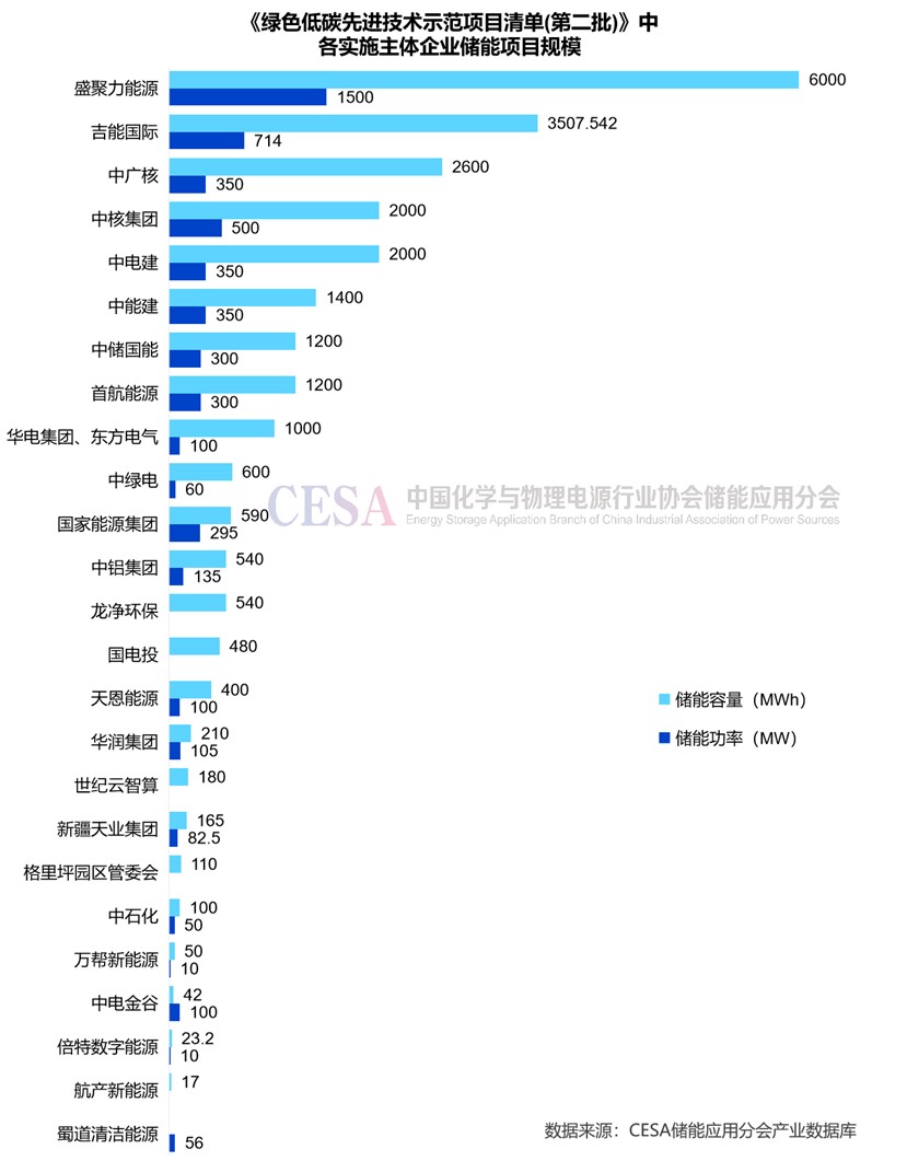 《綠色低碳先進(jìn)技術(shù)示范項(xiàng)目清單(第二批)》(公開征求意見稿)中儲(chǔ)能項(xiàng)目的實(shí)施主體包括盛聚力能源、吉能國際、中廣核、中核集團(tuán)、中電建、中能建、中儲(chǔ)國能、首航能源、華電集團(tuán)、東方電氣,這些主體建設(shè)的儲(chǔ)能規(guī)模均在1GWh以上。