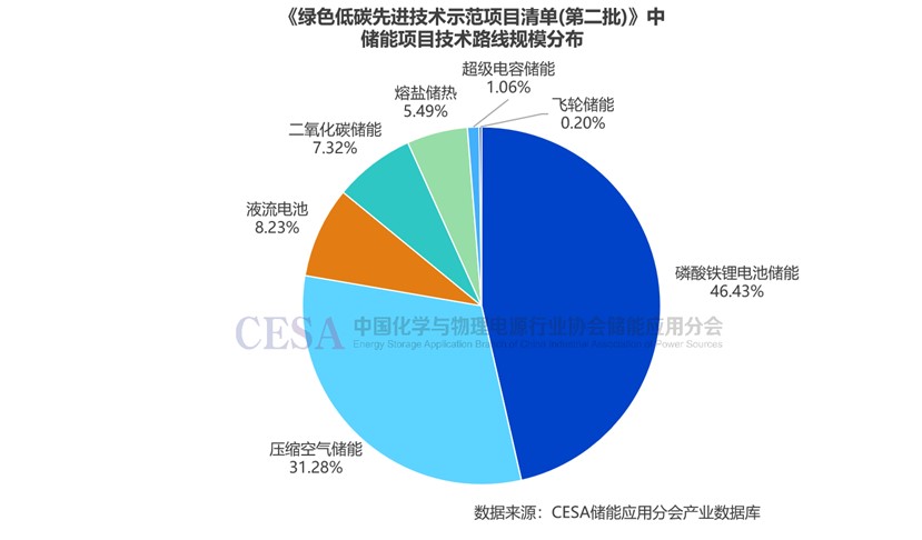 據(jù)CESA儲(chǔ)能應(yīng)用分會(huì)產(chǎn)業(yè)數(shù)據(jù)庫不完全統(tǒng)計(jì),本批次儲(chǔ)能相關(guān)示范項(xiàng)目中,磷酸鐵鋰電池儲(chǔ)能規(guī)模達(dá)2.54GW/9.94GWh,功率規(guī)模占比46.43%;壓縮空氣儲(chǔ)能規(guī)模高達(dá)1.71GW/8.5GWh,功率規(guī)模占比31.28%;液流電池儲(chǔ)能450MW/1800MWh,功率規(guī)模占比8.23%,二氧化碳儲(chǔ)能400MW/2200MWh,熔鹽儲(chǔ)熱300MW/2400MWh,超級(jí)電容儲(chǔ)能58MW,飛輪儲(chǔ)能11MW。