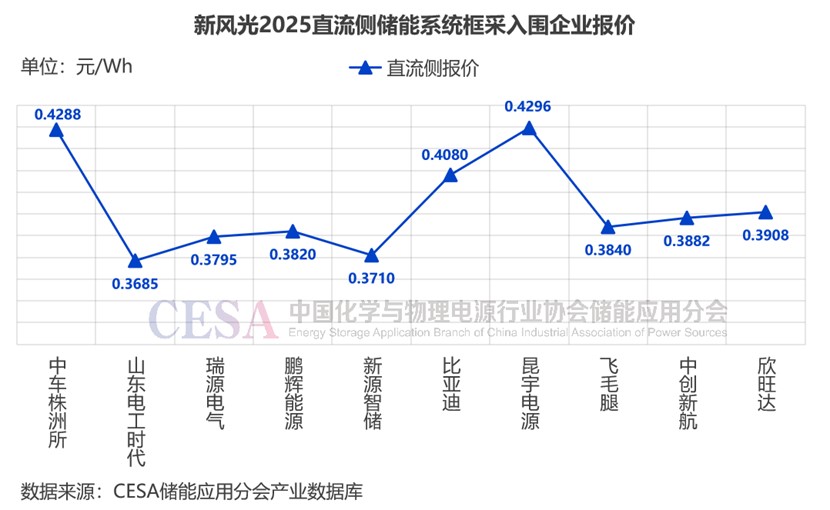 3月,直流側(cè)儲(chǔ)能系統(tǒng)集采/框采入圍投標(biāo)報(bào)價(jià)在0.3685-0.4296元/Wh范圍內(nèi),均價(jià)0.3931元/Wh。該報(bào)價(jià)主要來自于新風(fēng)光電子科技股份有限公司2025年儲(chǔ)能采購招標(biāo)標(biāo)段一1GWh直流側(cè)系統(tǒng)采購,中車株洲所、山東電工時(shí)代、瑞源電氣、鵬輝能源、新源智儲(chǔ)、比亞迪、昆宇電源、飛毛腿、中創(chuàng)新航、欣旺達(dá)成功入圍。