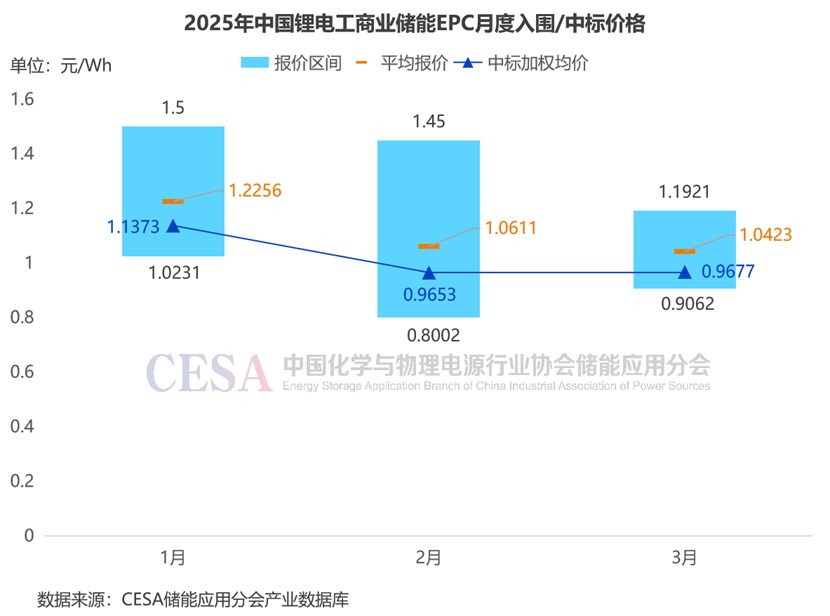 據(jù)CESA儲(chǔ)能應(yīng)用分會(huì)產(chǎn)業(yè)數(shù)據(jù)庫不完全統(tǒng)計(jì),2025年3月,鋰電儲(chǔ)能EPC/PC入圍投標(biāo)單價(jià)主要集中在0.4-1.3795元/Wh,平均報(bào)價(jià)0.9614元/Wh,中標(biāo)加權(quán)均價(jià)0.8551元/Wh,環(huán)比-9.49%。
