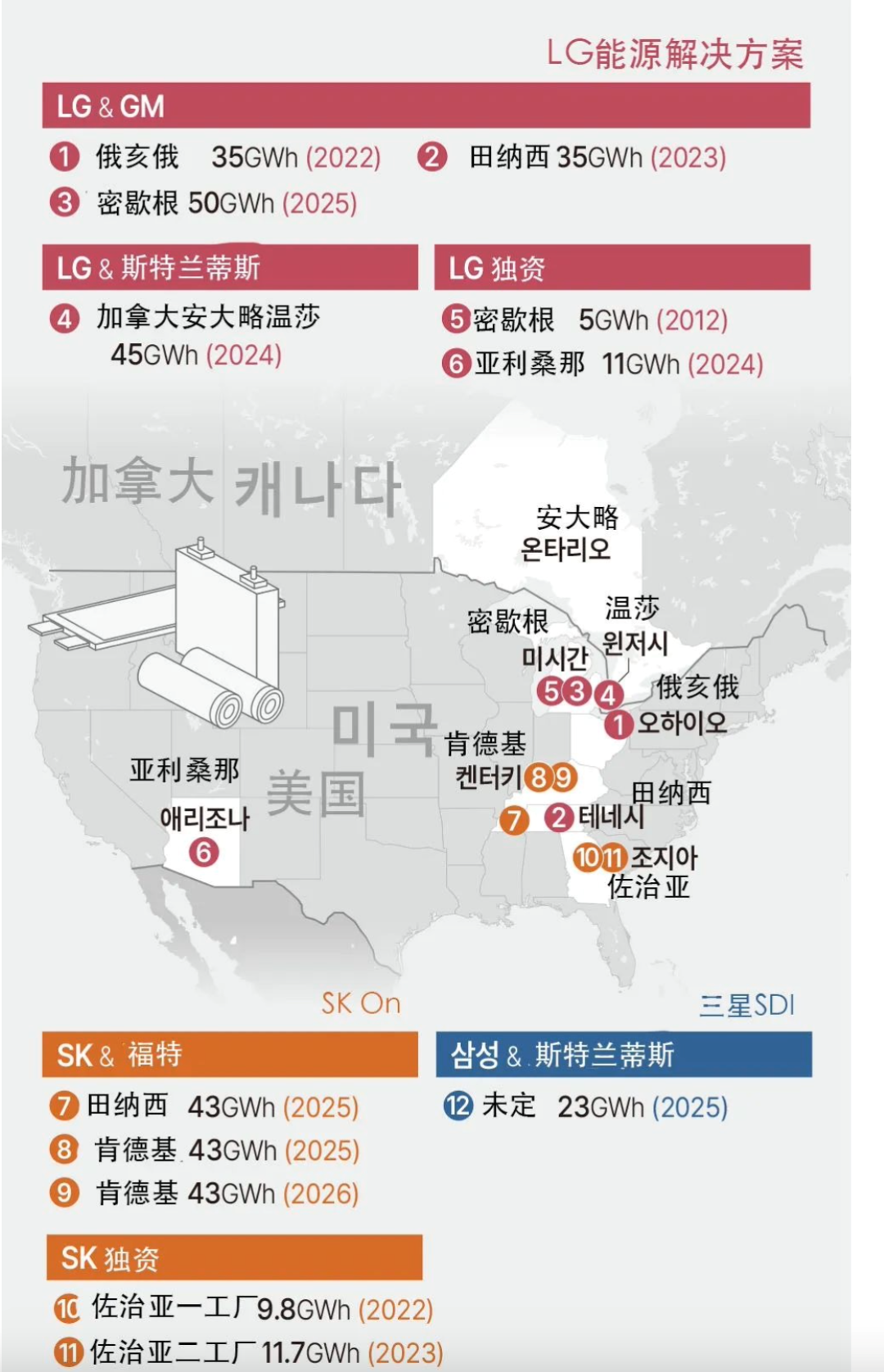另外一條被成為美國(guó)的電池帶(battery belt)的地方,是沿著美國(guó)西部阿巴拉契亞山脈的幾個(gè)州,比如俄亥俄、田納西、密西西比,基本上就是美國(guó)本土汽車三大廠和韓系三大電池廠的聯(lián)姻。雖然進(jìn)展緩慢,但是可以說(shuō)紙面產(chǎn)能還是充滿雄心壯志的,全部投產(chǎn)的話,加起來(lái)有快500GWh的產(chǎn)能,也可以說(shuō)是非常能打的。