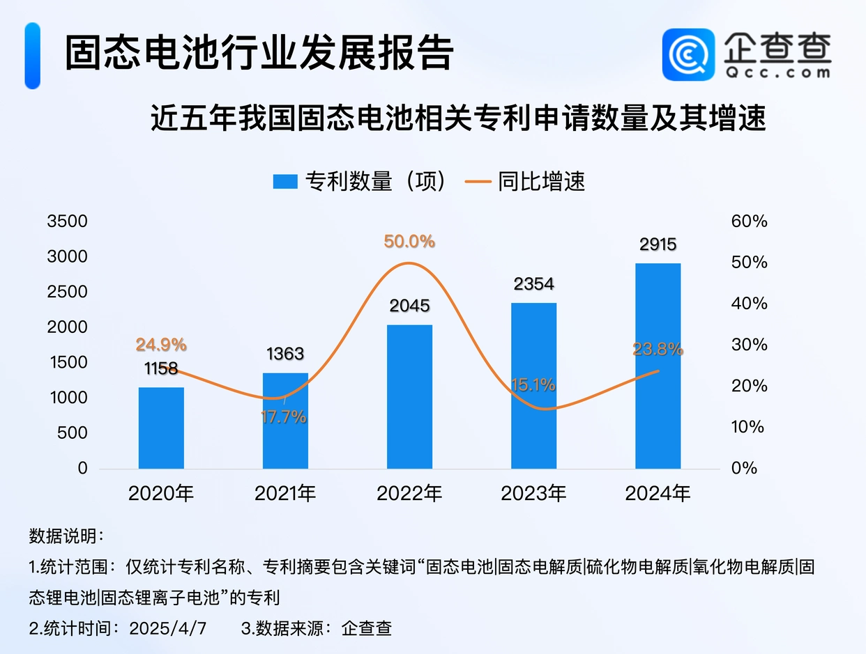 企查查數(shù)據(jù)顯示,2020年以來,我國固態(tài)電池相關(guān)專利申請量逐年增加,2022年申請量同比增加50.0%至2045項(xiàng),達(dá)近五年申請量增速峰值。2024年,我國累計(jì)申請2915項(xiàng)固態(tài)電池相關(guān)專利,創(chuàng)近五年申請量新高。