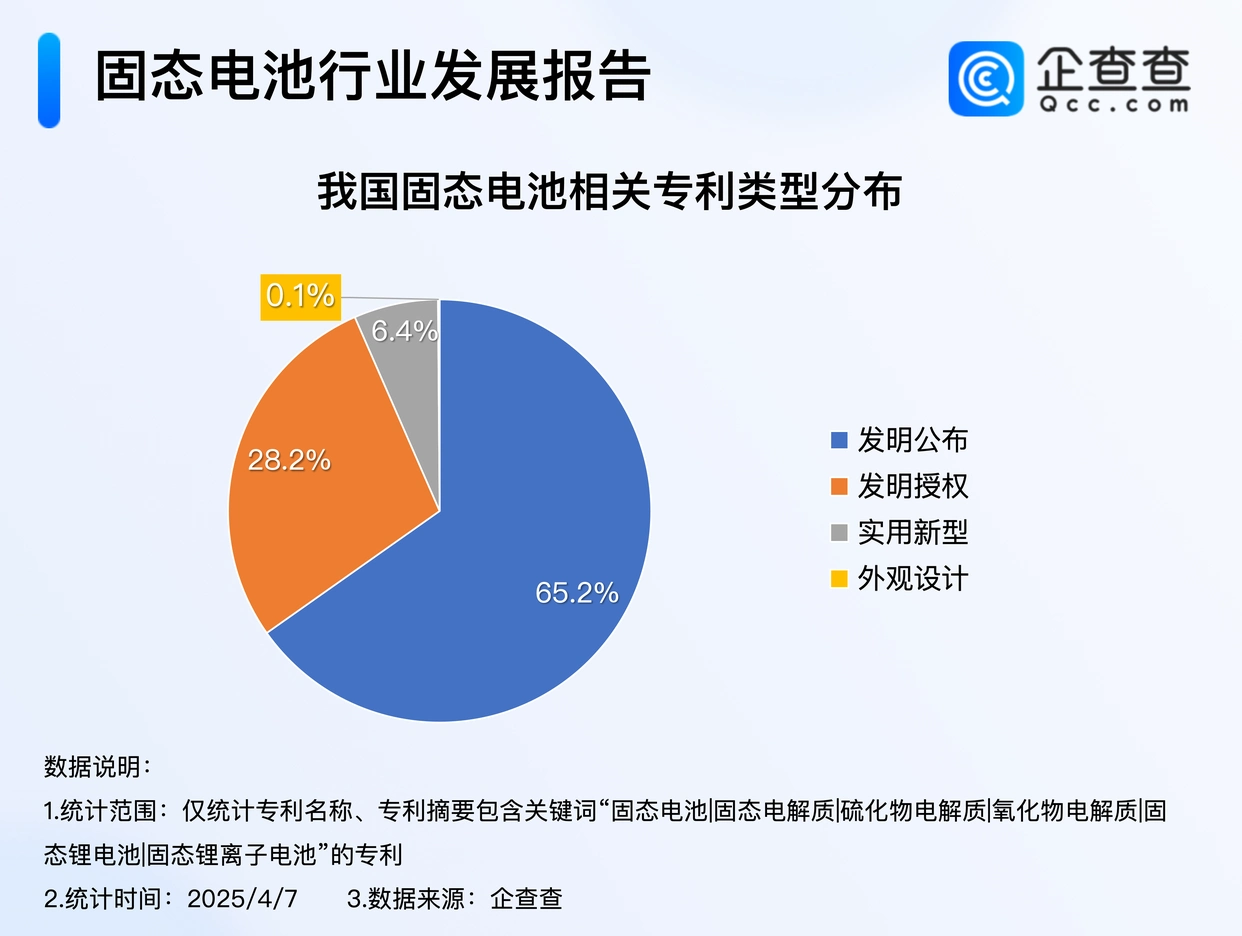 企查查數(shù)據(jù)顯示,截至4月7日,我國固態(tài)電池相關(guān)專利申請量達(dá)1.3萬項(xiàng),類型上以發(fā)明專利為主,占比超九成,其中發(fā)明公布占比65.2%,發(fā)明授權(quán)占比28.2%;外觀設(shè)計(jì)類占比最少,為0.1%。