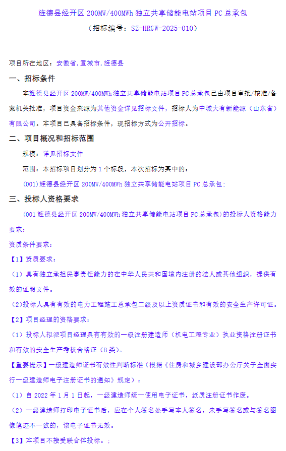 中國儲(chǔ)能網(wǎng)訊:4月9日,安徽省宣城市旌德縣經(jīng)開區(qū)200MW/400MWh獨(dú)立共享儲(chǔ)能電站項(xiàng)目PC招標(biāo)發(fā)布。項(xiàng)目建設(shè)地點(diǎn)位于安徽省旌德縣篁嘉開發(fā)區(qū)待建東外環(huán)路北,項(xiàng)目總面積約31968平方米,資金來源為自籌,招標(biāo)人為中城大有新能源(山東?。┯邢薰?。