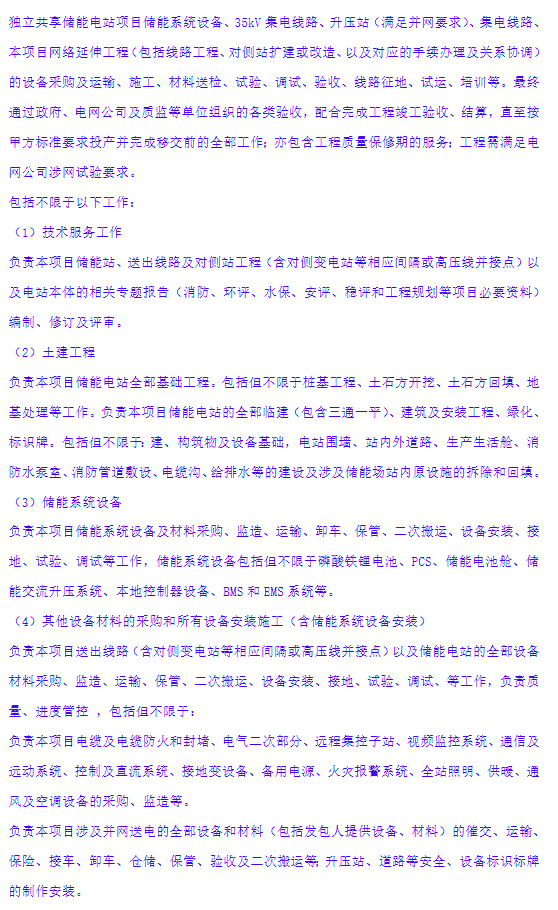 項(xiàng)目為PC交鑰匙工程,工程范圍包括旌德縣經(jīng)開區(qū)200MW/400MWh獨(dú)立共享儲(chǔ)能電站項(xiàng)目儲(chǔ)能系統(tǒng)設(shè)備、35kV集電線路、升壓站(滿足并網(wǎng)要求)、集電線路本項(xiàng)目網(wǎng)絡(luò)延伸工程(包括線路工程、對側(cè)站擴(kuò)建或改造、以及對應(yīng)的手續(xù)辦理及關(guān)系協(xié)調(diào))的設(shè)備采購及運(yùn)輸、施工、材料送檢、試驗(yàn)、調(diào)試、驗(yàn)收、線路征地、試運(yùn)、培訓(xùn)等。