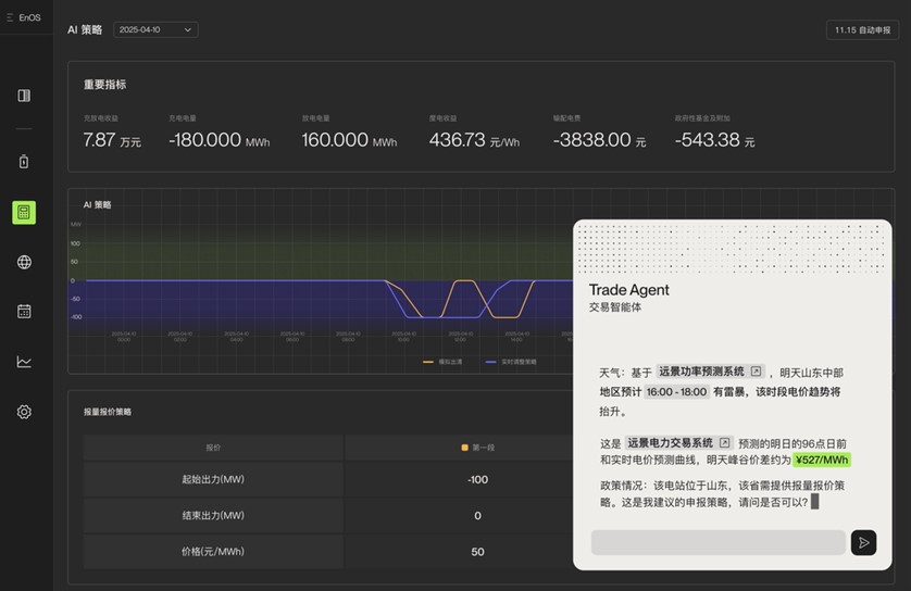 基于精準電價預測,遠景交易智能體自動整合實時設備狀態(tài)信息、各地交易規(guī)則策略模型,自生成AI交易策略,實現(xiàn)自動申報及控制閉環(huán),還可以根據(jù)交易結(jié)果,自動復盤,持續(xù)優(yōu)化交易策略;遠景交易智能體還打通了交易、生產(chǎn)和運維,通過智能排程,確保全生命周期收益最優(yōu)。