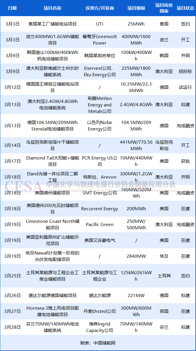 中國(guó)儲(chǔ)能網(wǎng)訊:2025年3月, CESA儲(chǔ)能應(yīng)用分會(huì)產(chǎn)業(yè)數(shù)據(jù)庫(kù)追蹤到20起海外儲(chǔ)能項(xiàng)目建設(shè)動(dòng)態(tài)事件,總規(guī)模超7.73GW/12.63GWh,涉及特斯拉、Arevon、道達(dá)爾能源、Pacific Green、Nofar Energy、Greenvolt Power、SMT Energy等全球能源投資方/開發(fā)商,建設(shè)地點(diǎn)位于澳大利亞、波蘭、德國(guó)、芬蘭、韓國(guó)、美國(guó)、泰國(guó)等國(guó)家。