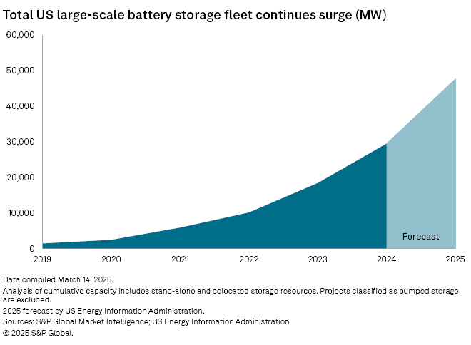 受套利和基本電網(wǎng)服務(wù)收入的推動(dòng),尤其是在加州 ISO 和德克薩斯州電力可靠性委員會(huì)市場(chǎng),美國(guó)電池儲(chǔ)能系統(tǒng)在 2020 年至 2024 年間增長(zhǎng)了十倍以上,超過了抽水蓄能。去年,電池儲(chǔ)能系統(tǒng)也首次超過了天然氣年度新增容量。