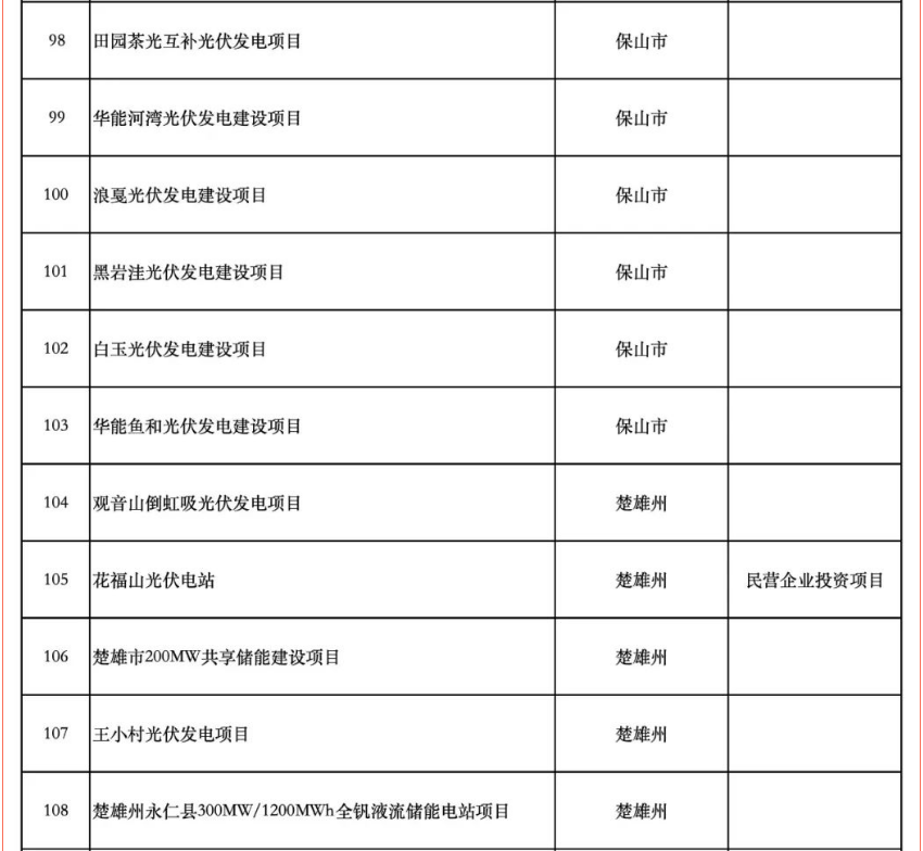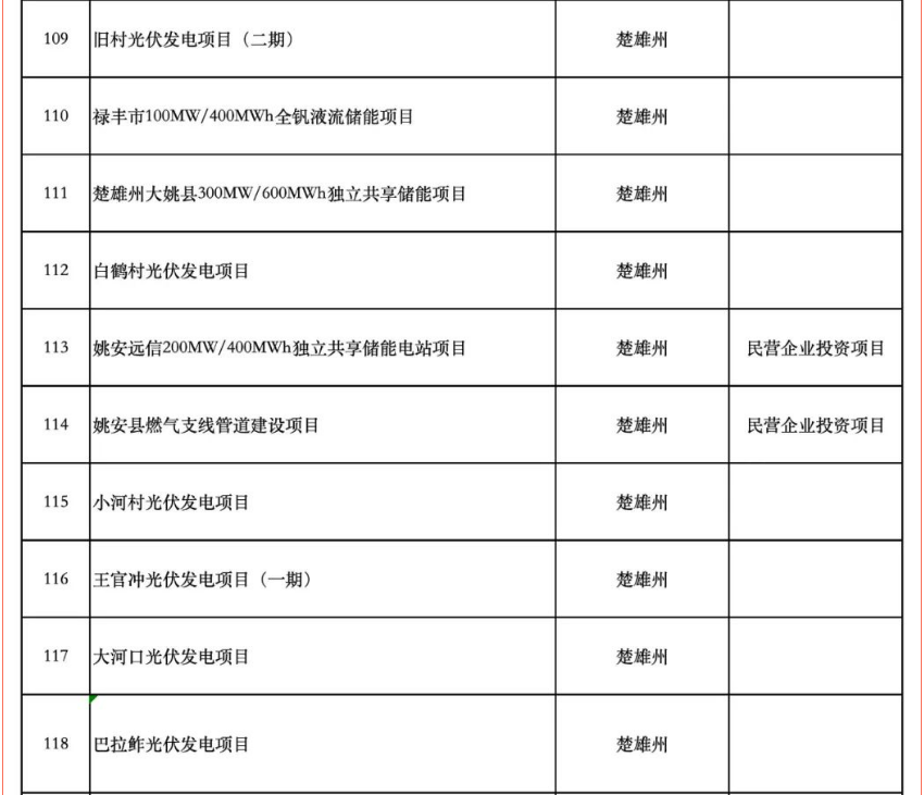 重大項目清單中含17個儲能項目。同時,楚雄州永仁縣300MW/1200MWh全釩液流儲能電站項目列為“重中之重”項目清單。