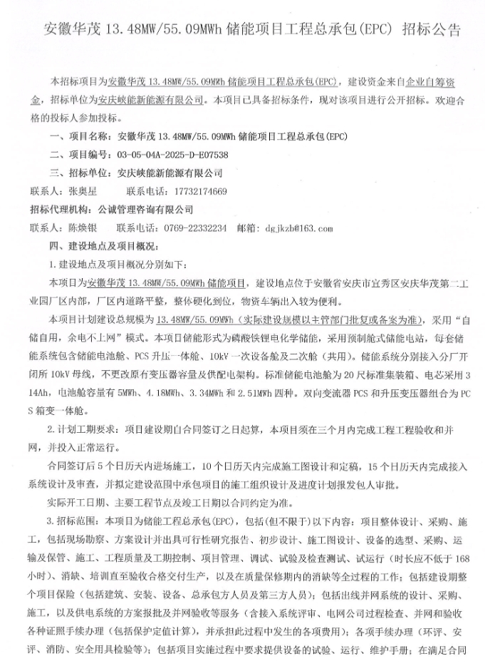 中國(guó)儲(chǔ)能網(wǎng)訊:4月14日,安徽華茂13.48MW/55.09MWh儲(chǔ)能項(xiàng)目工程總承包(EPC)項(xiàng)目招標(biāo)公告發(fā)布,項(xiàng)目招標(biāo)人為安慶峽能新能源有限公司,項(xiàng)目位于安徽省安慶市宜秀區(qū)安慶華茂第二工業(yè)園廠區(qū)內(nèi)部。