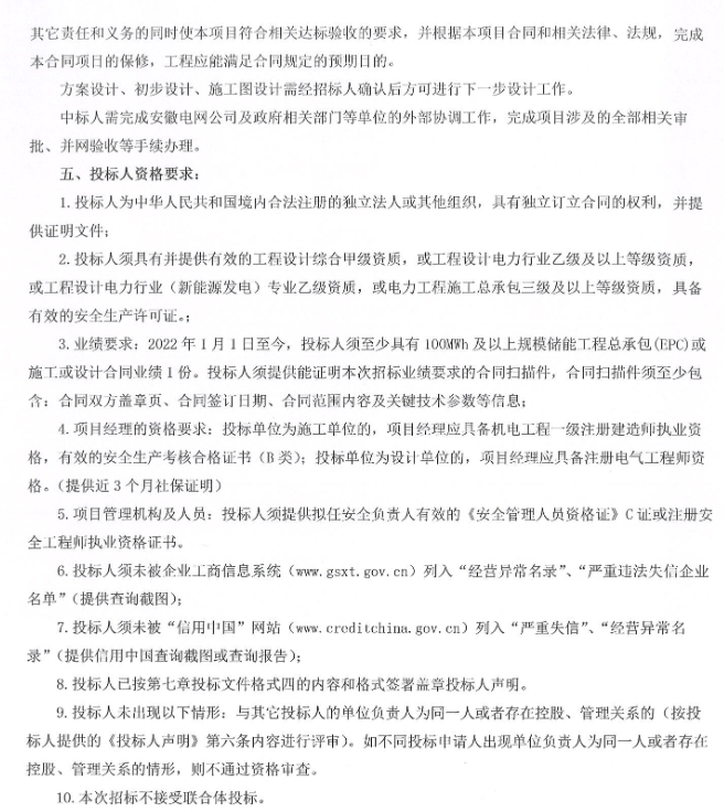 要求2022年1月1日至今,投標(biāo)人須至少具有100MWh及以上規(guī)模儲(chǔ)能工程總承包(EPC)或施工或設(shè)計(jì)合同業(yè)績(jī)1份。