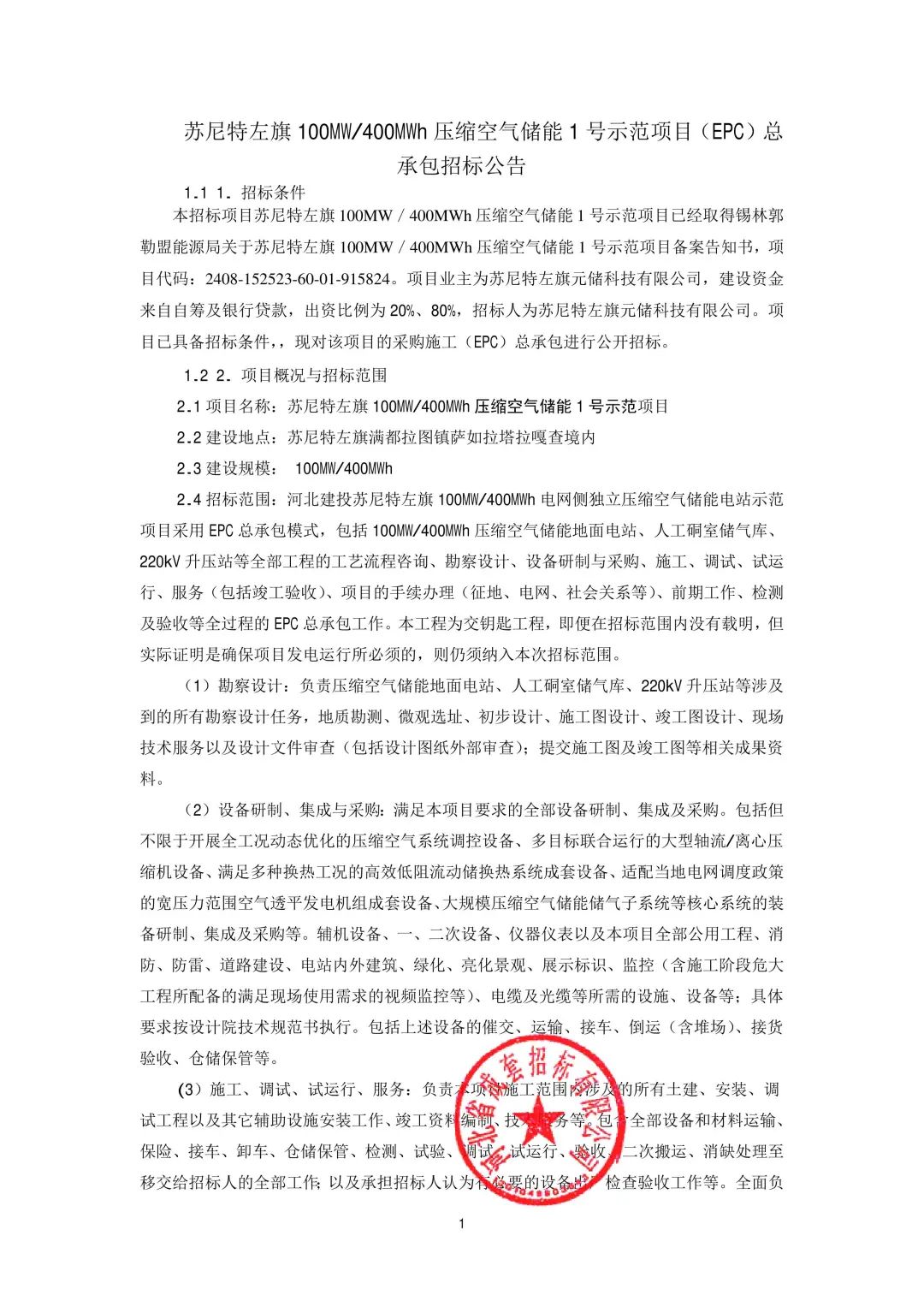 中國儲能網(wǎng)訊:4月15日,蘇尼特左旗100MW/400MWh壓縮空氣儲能1號示范項目(EPC)總承包招標(biāo)公告發(fā)布。