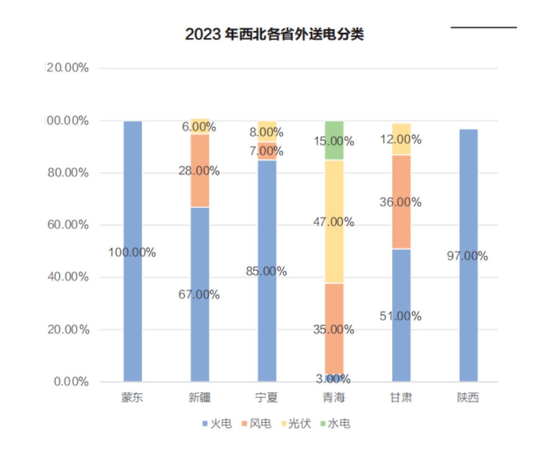 圖表所示不難看出,各個(gè)電力輸出大省,以火電外送為主。這也從側(cè)面證明了另一個(gè)特高壓外送新能源的問(wèn)題:在特高壓線(xiàn)路上,外送的新能源占比太低。