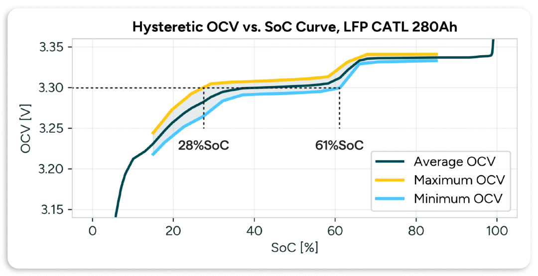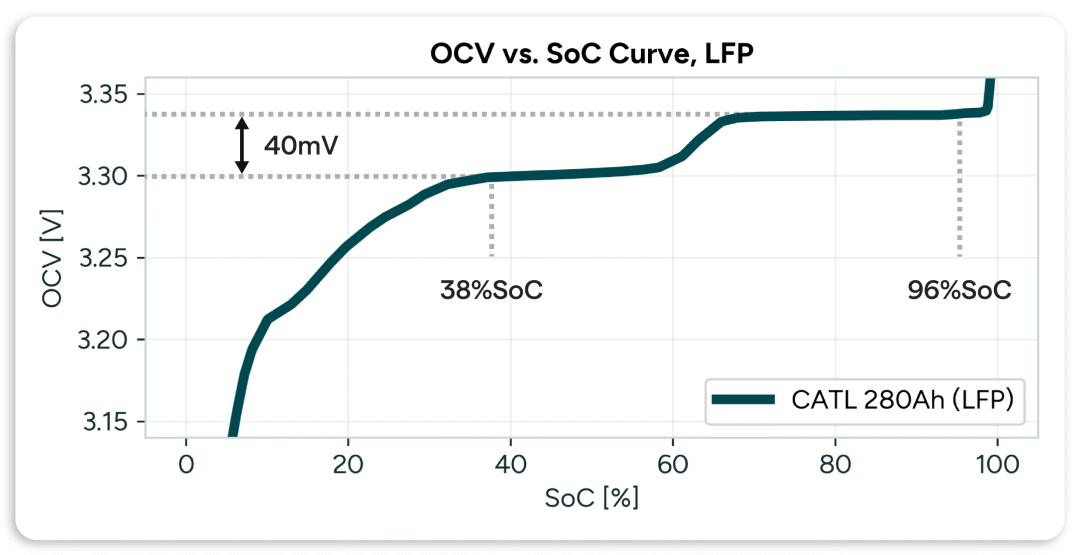低至 40mV 的開(kāi)路電壓 (OCV) 就會(huì)掩蓋靜止 LFP 電池 96% 和 38% SoC 之間的差異。