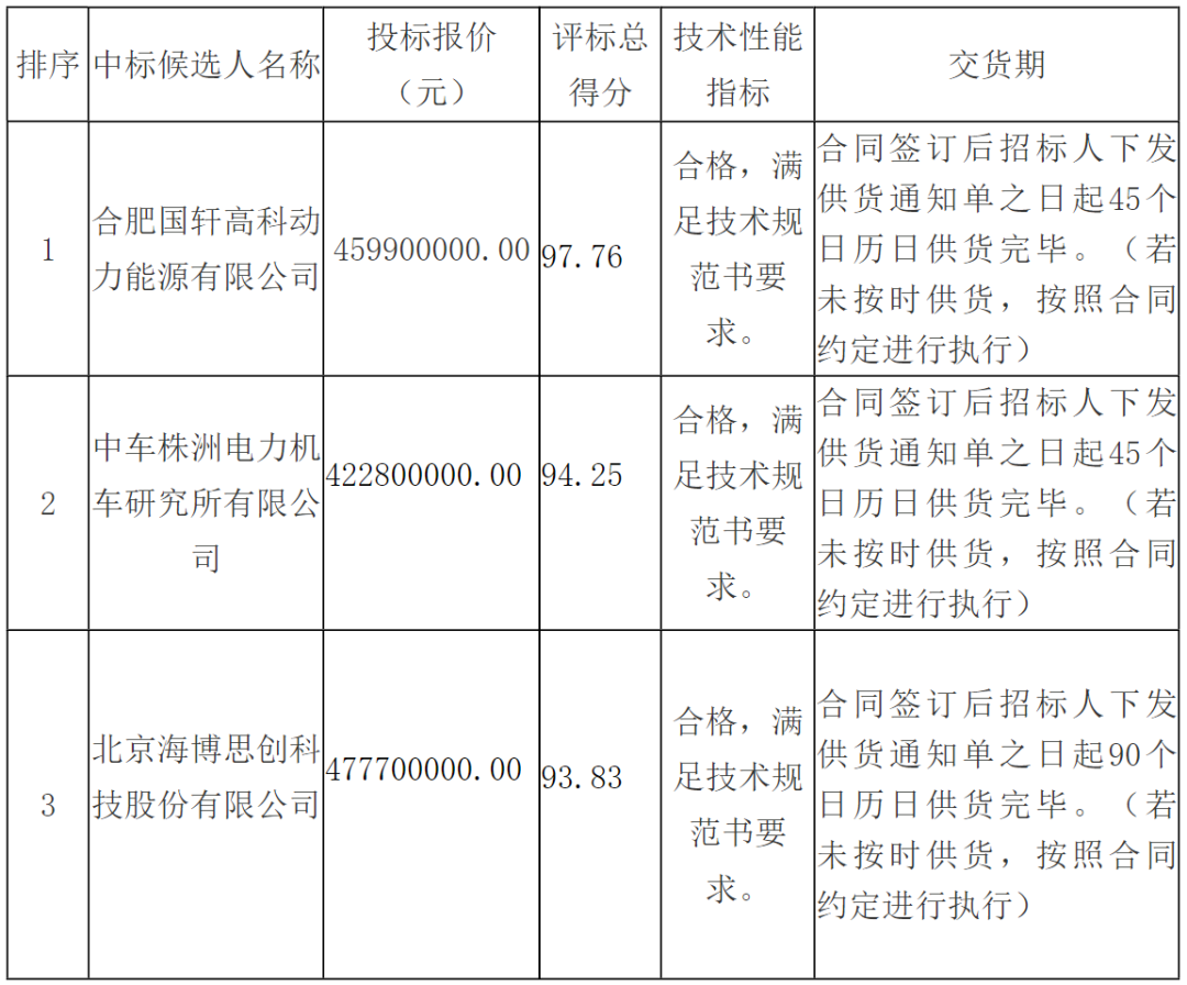 根據(jù)公告,第一中標(biāo)候選人為合肥國(guó)軒高科動(dòng)力能源有限公司,投標(biāo)報(bào)價(jià)459900000元,折合單價(jià)0.46元/Wh;第二中標(biāo)候選人為中車(chē)株洲電力機(jī)車(chē)研究所有限公司,投標(biāo)報(bào)價(jià)422800000元,折合單價(jià)0.423元/Wh;第三中標(biāo)候選人為北京海博思創(chuàng)科技股份有限公司,投標(biāo)報(bào)價(jià)477700000元,折合單價(jià)0.478元/Wh。