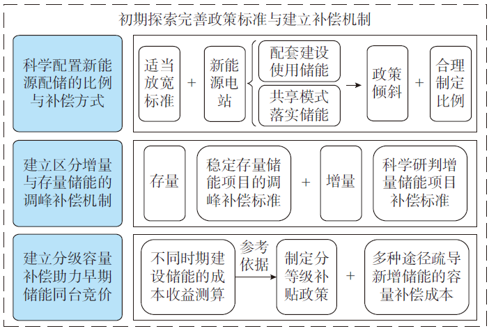 1)初期探索完善政策標(biāo)準(zhǔn)與建立補(bǔ)償機(jī)制。初期,受成本、技術(shù)限制,儲(chǔ)能項(xiàng)目收益欠佳、競(jìng)爭(zhēng)力弱,政策引導(dǎo)和補(bǔ)貼至關(guān)重要。初期完善政策與補(bǔ)償機(jī)制的具體方案見(jiàn)圖3。