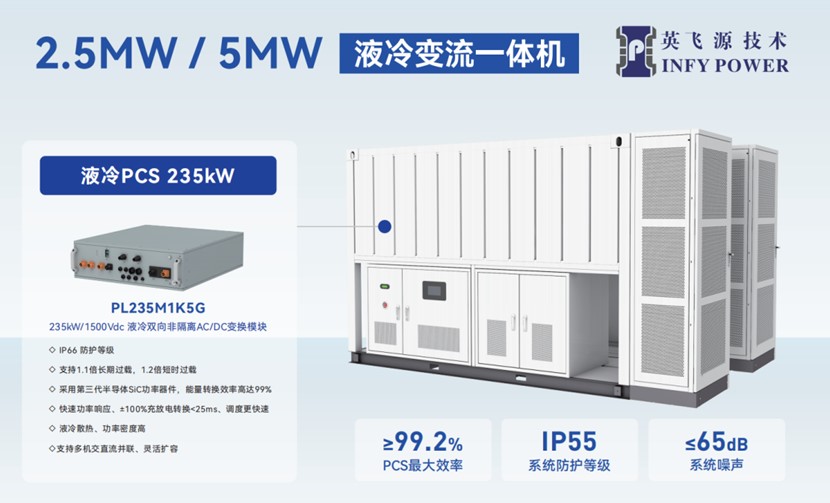 魯力表示,英飛源此次推出的明星產品液冷變流一體機采用模塊化設計,單機功率覆蓋2.5MW-5MW,PCS采用全SiC功率器件設計,最大效率大于99.2%,采用組串式架構,靈活配置2.5MW/5MW等不同功率等級;液冷方式散熱可使PCS降低溫控風險,系統(tǒng)防護IP55,PCS防護等級IP66,可適應各種極端條件使用;智能運維系統(tǒng)可實現(xiàn)實時監(jiān)控,提前預警,故障定位,支持遠程OTA升級與故障隔離,運維成本降低40%。