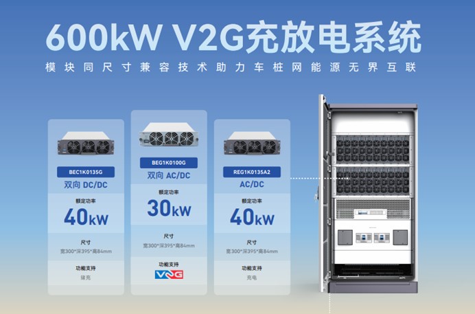 其“光儲超充放”解決方案通過技術創(chuàng)新,實現(xiàn)了光伏與V2G的無縫整合,系統(tǒng)支持光伏直流母線接入及車網(wǎng)互動(V2G),電動汽車可反向饋電至電網(wǎng),平衡負荷并降低用戶用電成本。例如,600kW V2G系統(tǒng)通過智能調度策略優(yōu)化充放電,提升電網(wǎng)穩(wěn)定性,同時為車主創(chuàng)造收益。