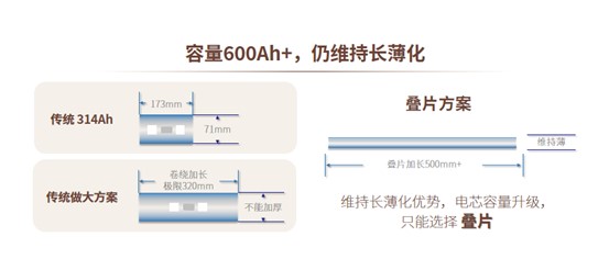 (圖示)這是下一代電芯的大概發(fā)展方向,我們經(jīng)過(guò)五六年的時(shí)間,正好趕到了下一代電芯的風(fēng)口上,314的時(shí)代更多是短刀,疊片在這個(gè)尺寸下也沒(méi)有什么成本優(yōu)勢(shì),在性能方面是有優(yōu)勢(shì)的。在下一代的情況下,電芯向大的情況下怎么辦?只能是變寬,這有一個(gè)上限,所以我們一般評(píng)估在320毫米左右就到上限了,再往大走,只能用疊片的路線。疊片的路線不太好做,有好多的工藝需要解決,有好多生產(chǎn)過(guò)程中的管控問(wèn)題,我們用了五六年的時(shí)間,攻克的大批量的這種問(wèn)題。