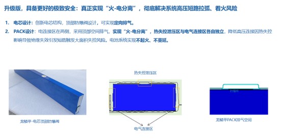 (圖示)這是我們?cè)谙氲?,基于刀片能夠做怎么樣的?chuàng)新,我們?cè)谲?chē)端已經(jīng)用了,在兩側(cè)出吉爾的情況下,把防爆閥的方向沖上或者沖下就可以,這樣我們的電和氣不能在熱失控的時(shí)候碰到。好多系統(tǒng)設(shè)計(jì)上的考量,絕緣等好多的考量,當(dāng)電芯熱失控的時(shí)候,好多東西都已經(jīng)失去了它的防護(hù)特性,失去了設(shè)計(jì)指標(biāo),所以這是我們覺(jué)得最核心的。后面因?yàn)殚L(zhǎng)壽命的演變,黃教授做了很多體系方面的研究,我們公司也在做這方面的相應(yīng)應(yīng)用。