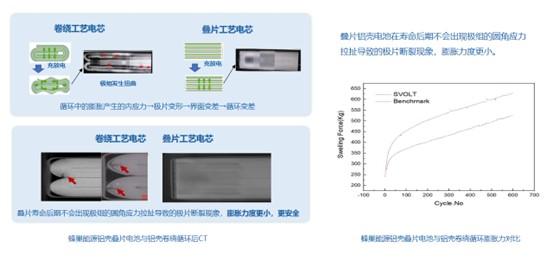 (圖示)疊片和卷繞的區(qū)別,左邊的圖,一個(gè)是它的空間利用率,第二個(gè)是硬力。右邊的圖是我們做了相應(yīng)循環(huán)之后的CT掃描,左邊是卷繞,兩個(gè)機(jī)組,在循環(huán)末端幾組有褶皺,邊緣有撕裂,這樣一個(gè)是局部發(fā)熱,內(nèi)部析鋰,右邊是整個(gè)疊片界面比較良好。